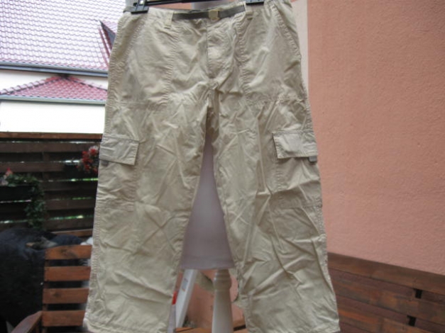Diese Bermuda besitzt einige Taschen, die teilweise mit Klettverschlüssen verschlossen werden. Der genaue Farbton ist ein Hellbeige. Hier einige Maßangaben: