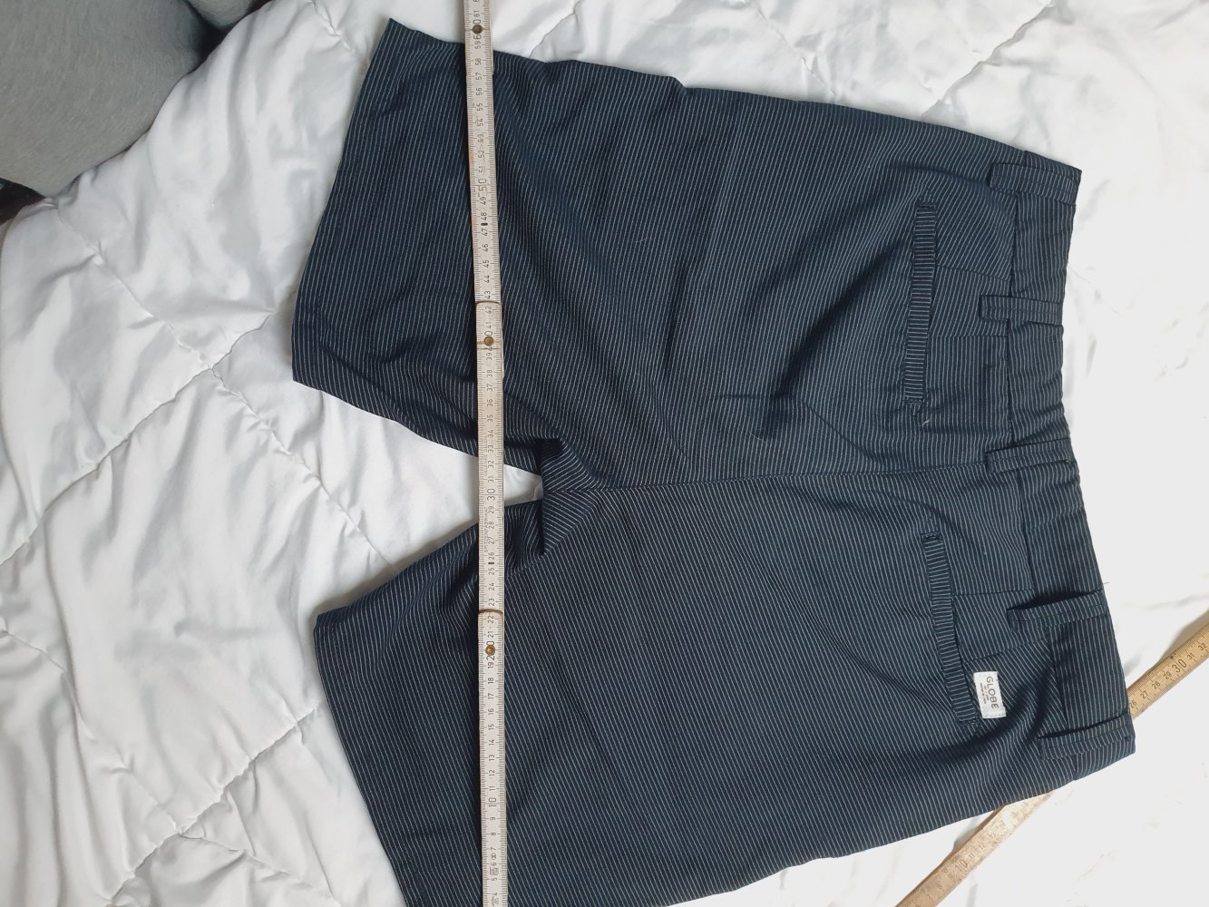 Verlaufe hier eine sehr schöne kurze Hose von Globe. Sie ist dunkel grau /Anthrazit und weiß gestreift. Man kann sie zu der feineren Mode / Design zählen. Sehr gut verarbeitete Taschen und Nähte. In der linken Hosentasche ist noch eine kleine versteckte Reisverschlusstasche.
