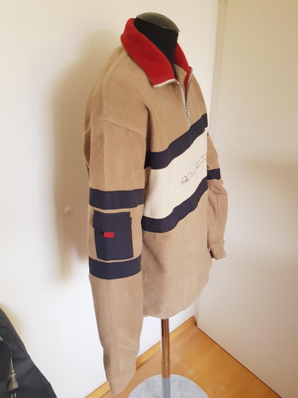 links an den seitlichen Ärmel eine Eingriffstaschen Verschluss mit Klett, Stehkragen in rot mit Reißverschluss.