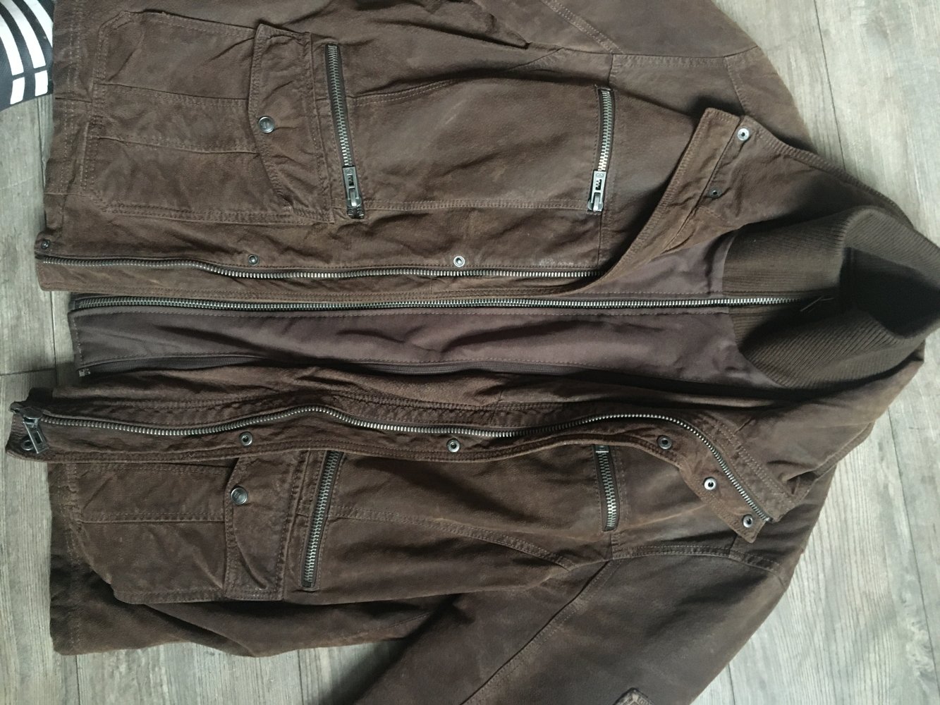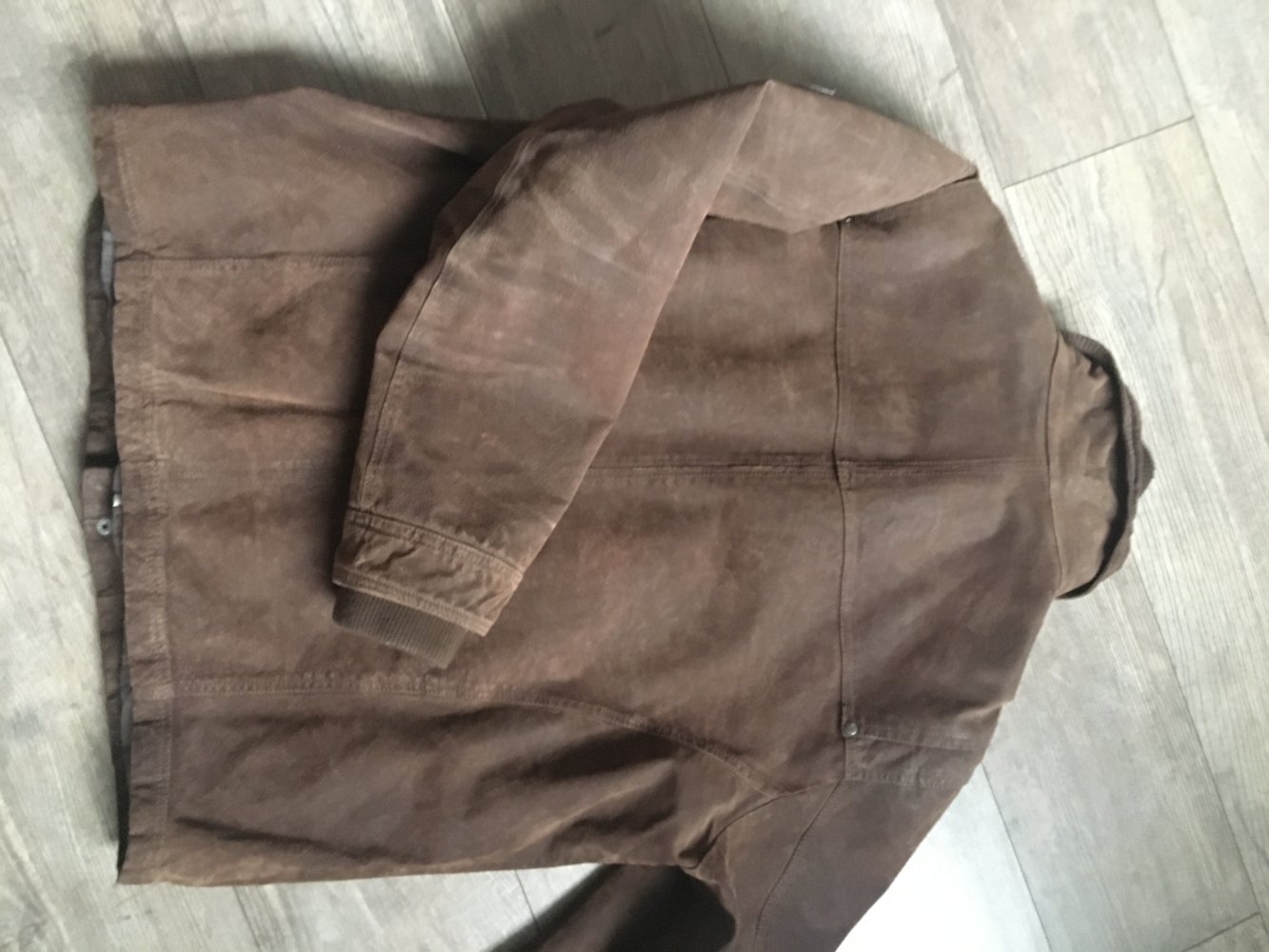 Die Jacke ist aus Wildleder, robust, hat keine Mängel, einen Doppelreissverschlusss und einen Innenkragen.