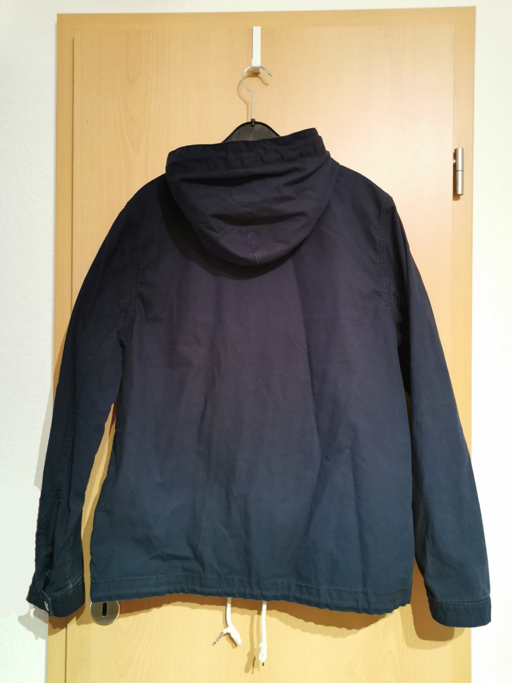 Ich biete diese Jacke von H&M an. Sie ist dunkelblau und hat die Größe M. Die Jacke hat zwei Taschen mit Druckknöpfen, Kordelzüge am Bund und am Kapuzenkragen. Am Handgelenk kann die Jacke enger oder locker gestellt werden mit einem Druckknopf und hat einen Reißverschluss sowie eine Druckknopfleiste als Verschluss. Die Jacke ist aus einem leichtem Stoff und ist für einen warmen Frühling oder Herbst geeignet. Die Jacke wurde getragen und an ihr sind leichte Gebrauchsspuren erkennbar. Dennoch ist sie in einem sehr gutem Zustand.