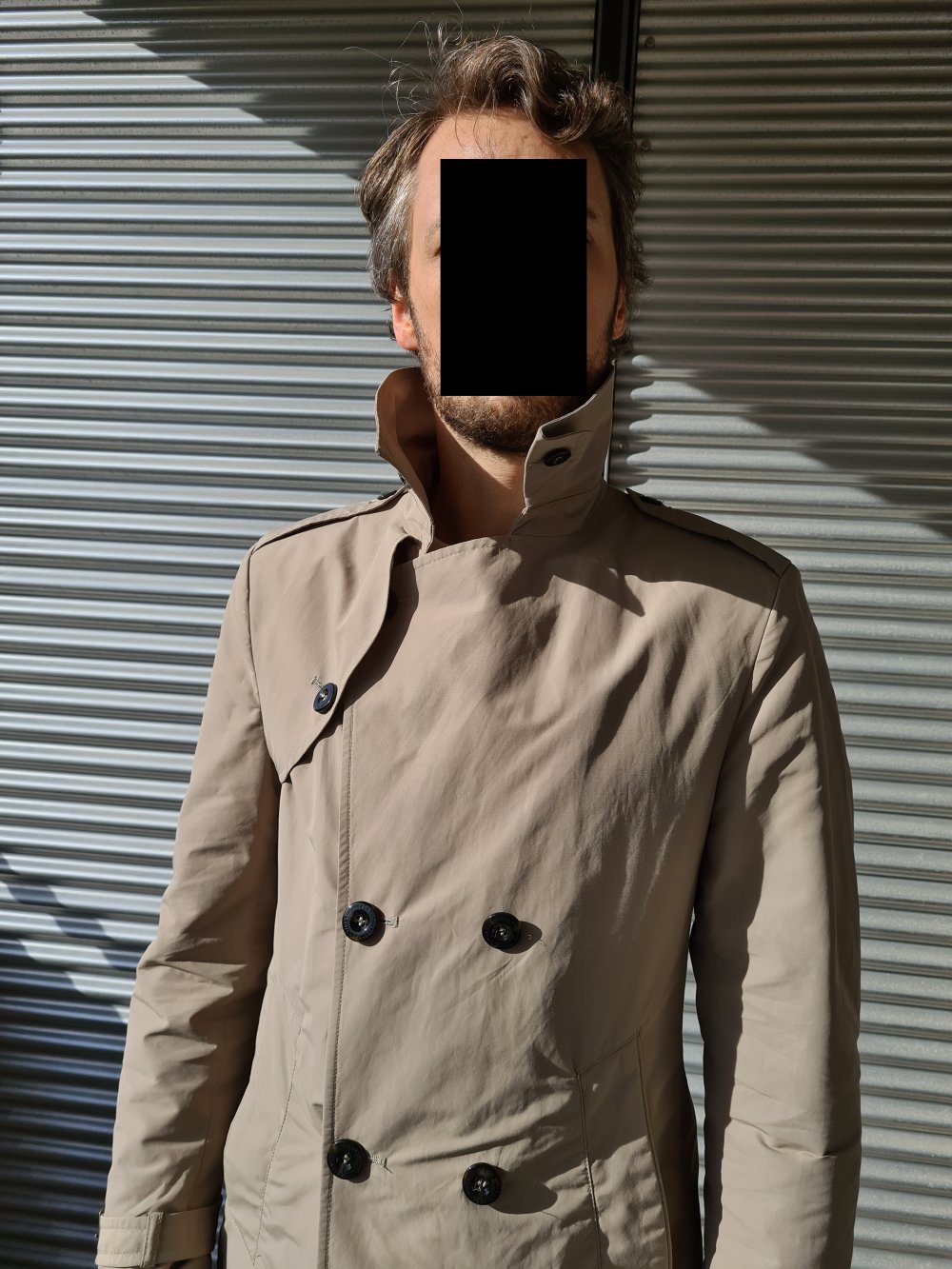 Komplett knöpfbar mit Throat Latch, verstellbaren Riegeln an den Ärmeln, abnehmbarer Gürtel, Storm Flap an der Schulter sowie Cape im Rücken.