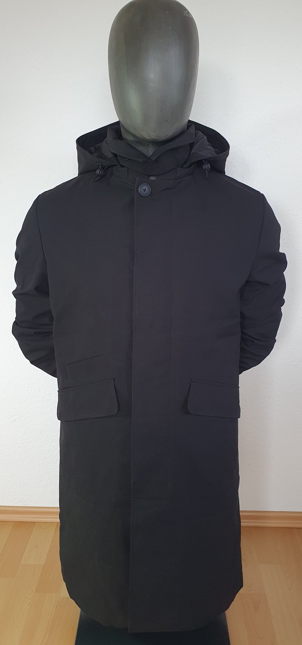 Toller Parka den man sowohl als Business Mantel als auch elegant sportlicher Casual Mantel tragen kann. Die durch Reißverschluss abnehmbare Kapuze lockert das ganze auf. Sehr edel verarbeitet aus hauptsächlich recyceltem Material! Besonders dezent durch die versteckte Knopfleiste. Die Farbe ist tiefschwarz, auch wenn es auf manchen Bildern durch die Lichteffekte etwas anders aussieht. Der Mantel gibt ausreichend warm für die kalten Wintermonate. Mit Hemd oder Tshirt auch für den Übergang sehr gut geeignet. Sehr selten getragen, daher in einem ausgezeichnetem Zustand!