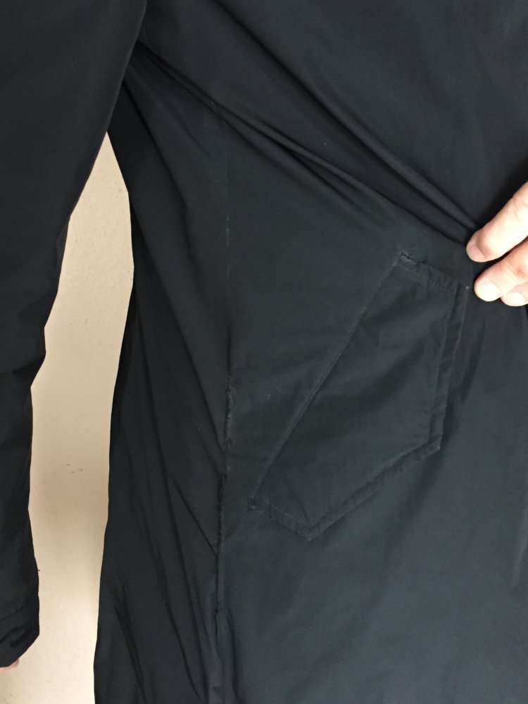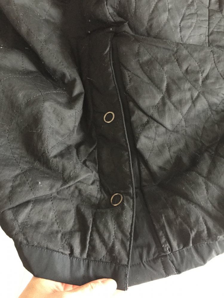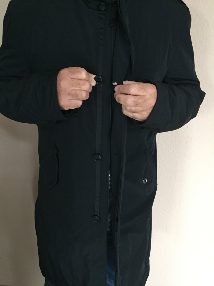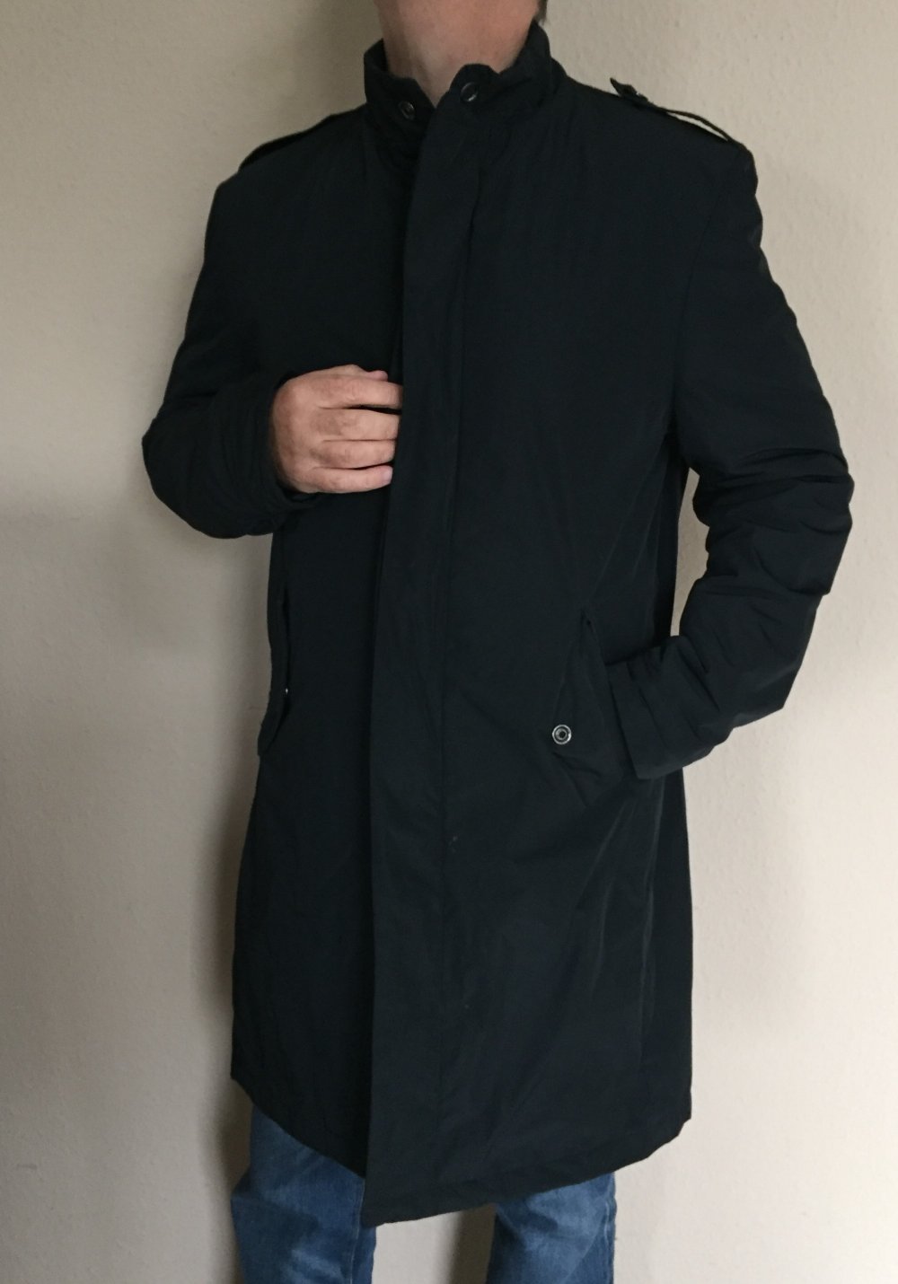 It´s Regen Kurzmantel Gr.L wattiert, schwarz mit Gehschlitz toller Mantel der in einem guten Zustand ist mit einem Schönheitsfehler die rechte Seitennaht (siehe letztes Foto), wurde unsachgemäß repariert. Der Mantel ist durchaus tragbar und wen´s stört kann die Naht ja noch mal richtig ausbessern lassen.