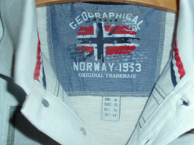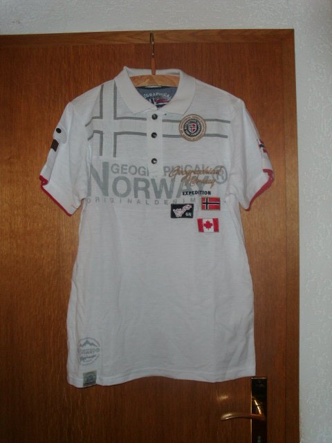 Biete hier ein Poloshirt von Geographical Norway in Größe L an. Das Shirt ist mit Gr. XL angegeben, aber es fällt kleiner aus, gebe unten noch die Maße an.Es handelt sich um das Model Klipo in weiß aus 100% Baumwolle. Vorn mit kurzer Knopfleiste und verschiedenen Emblemen und Schriftzügen. Auf dem rechten Ärmel befindet sich eine kleine Tasche. Hinten ist das Poloshirt schlicht weiß und unter dem Kragen befindet sich ein Schriftzug. Das Poloshirt wurde nur vorgewaschen aber nie getragen, da zu klein und ist somit neu. Wieder ein Schrank-Aufräum-Fund.