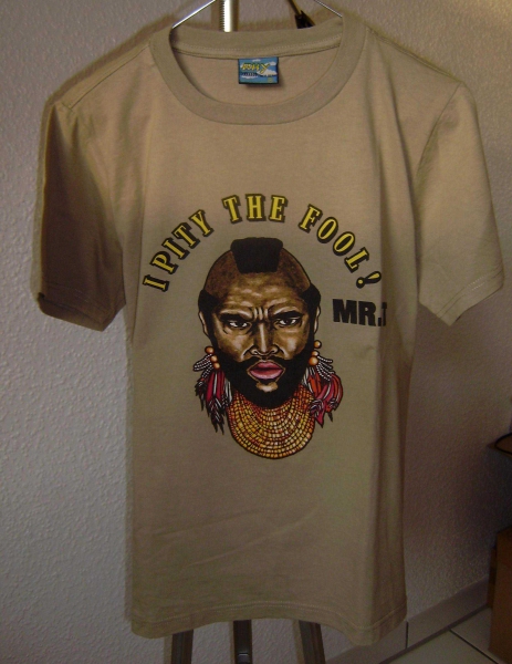 Als Aufdruck: I PITY THE FOOL, was übersetzt bedeutet „Ich habe Mitleid mit dem Narren“.
