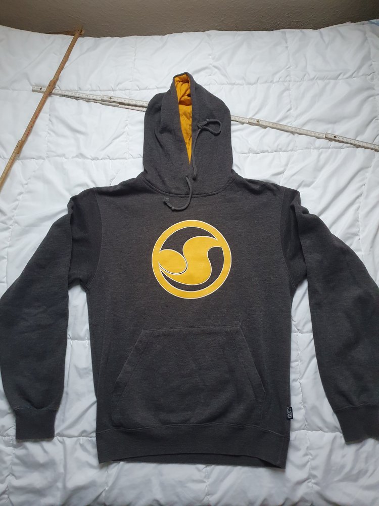 Es handelt sich um einen originalen Kapuzenpullover von DVS in grau meliert mit gelbem Logo. Er hat auch eine Buchtasch und die Kapuze ist innen mit gelb abgesetzt.