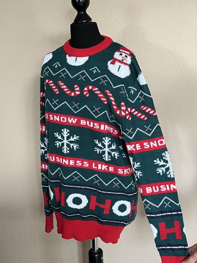 H&M Bad Taste Christmas Pullover Gr.S grün bunt mit Schneemann. Ist natürlich Geschmackssache, zaubert aber auf alle Fälle ein Lächeln ins Gesicht während der Weihnachtszeit.