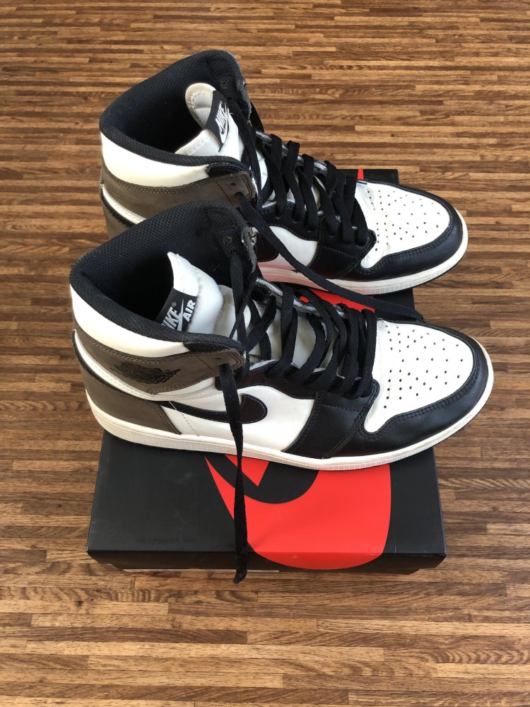 Ich verkaufe meinen Jordan 1 High OG 'Dark Mocha' in der Größe EU44/US10/UK9 in den Farben Braun/Schwarz/Weiß.