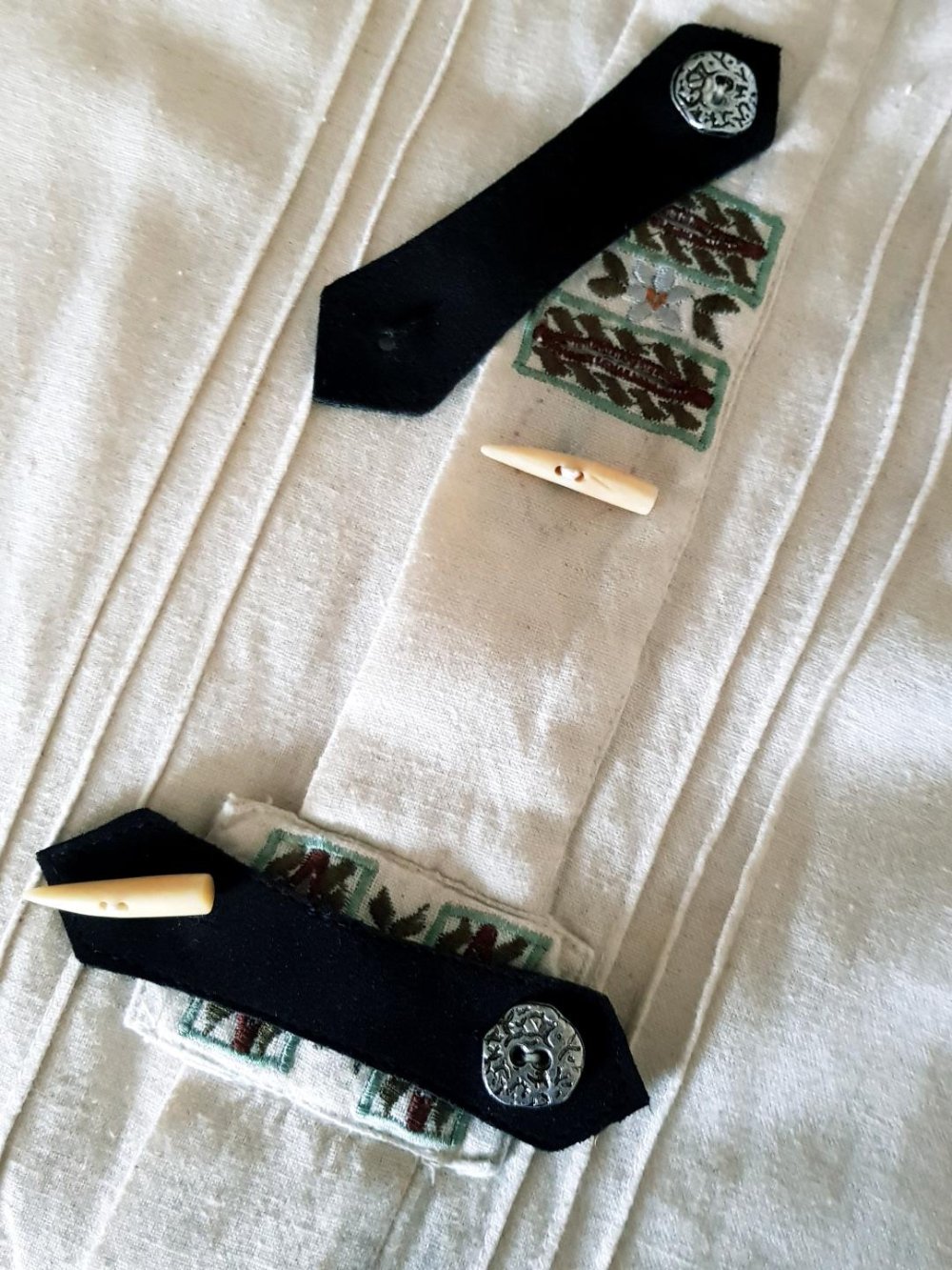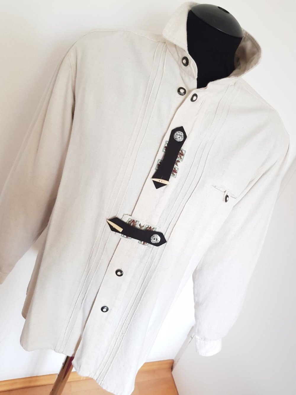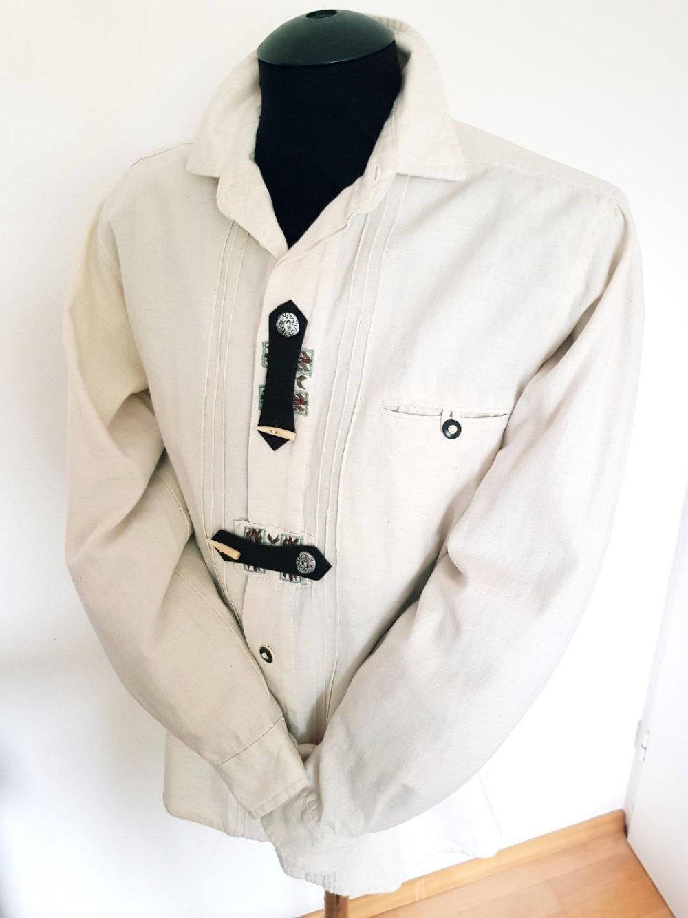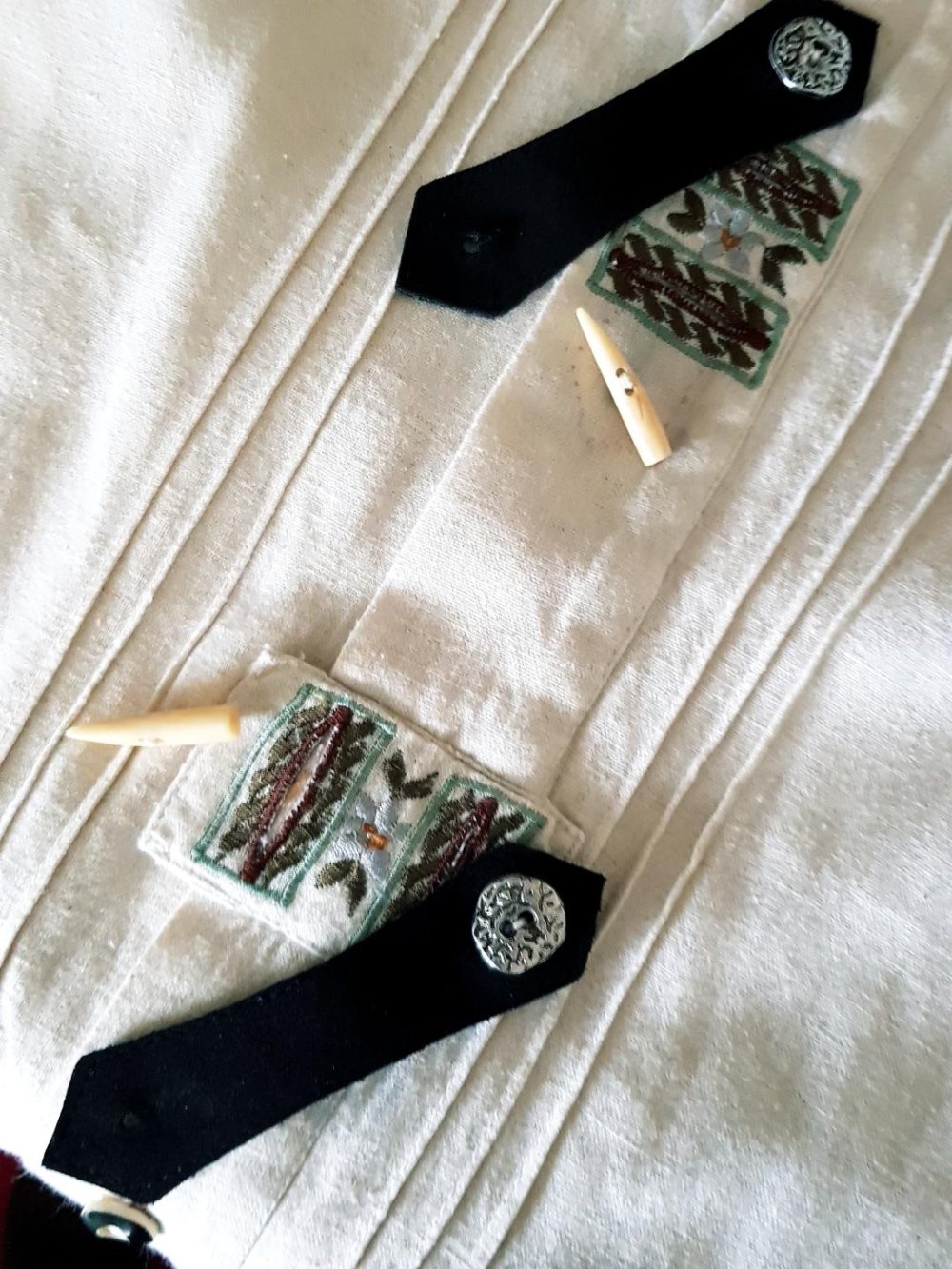 Das Hemd passt toll zu Janker und Lederhose mit einem klassischen Kragen, das Vorderteil ist mit zwei Lederriegel und Knopf & Hirschhorn verziert, und der Stoff unterteil noch mit Wappen gestickt. An der linken Vorderseite ist eine Brusttasche eingenäht, das Rückenteil hat in der Mitte eine Falte