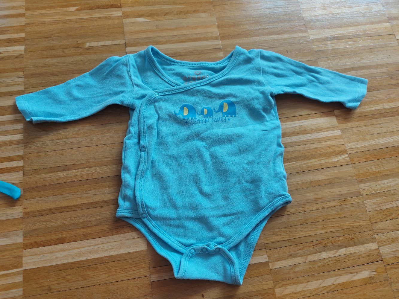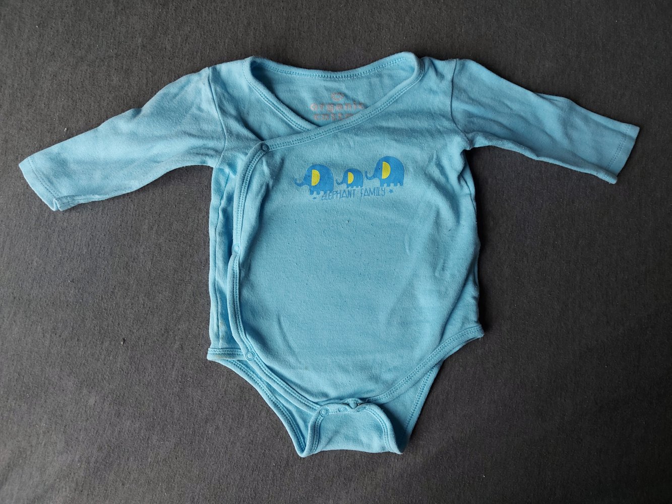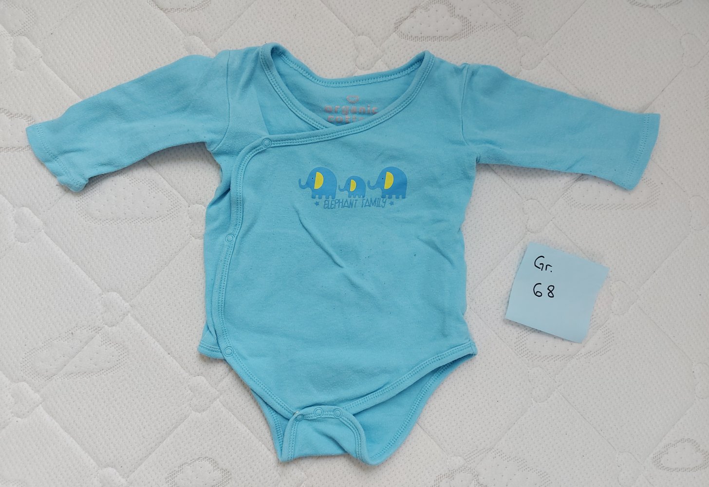 Supersüßer Langarm-Wickelbody mit blauen Elefanten in Gr. 68 aus 100% Bio-Baumwolle. Leichtes Pilling an den Ärmeln, sonst prima Zustand.