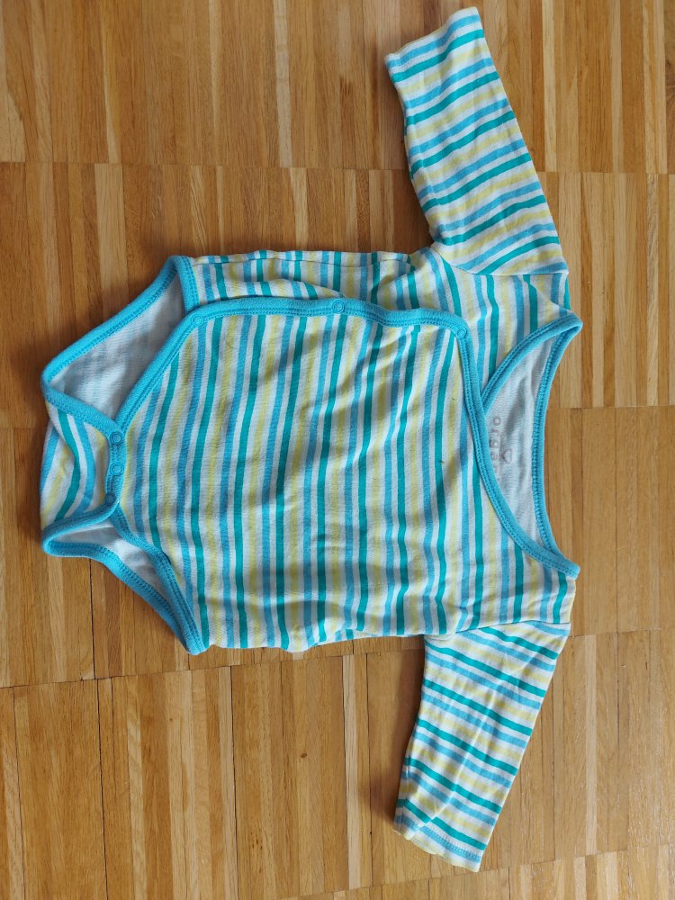 Supersüßer Langarm-Wickelbody mit blauen und türkisen Streifen in Gr. 68 aus 100% Bio-Baumwolle. Leichtes Pilling an den Ärmeln, sonst prima Zustand.
