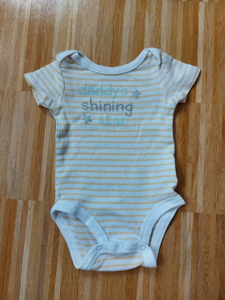 weiß-gelb gestreifter Kurzarm-Body mit dem Spruch "Daddy's shining star". Er hat einen dehnbarem amerikanischen Ausschnitt und ist aus 100% Baumwolle. Tadelloser Zustand.