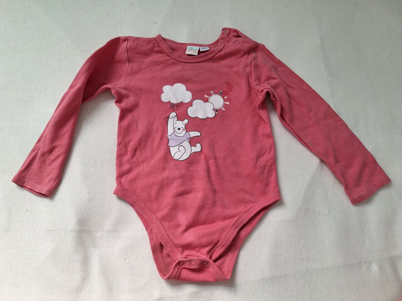 Bequemer korallenfarbiger Langarmbody mit Winnie Pooh-Motiv, Gr. 86/92.