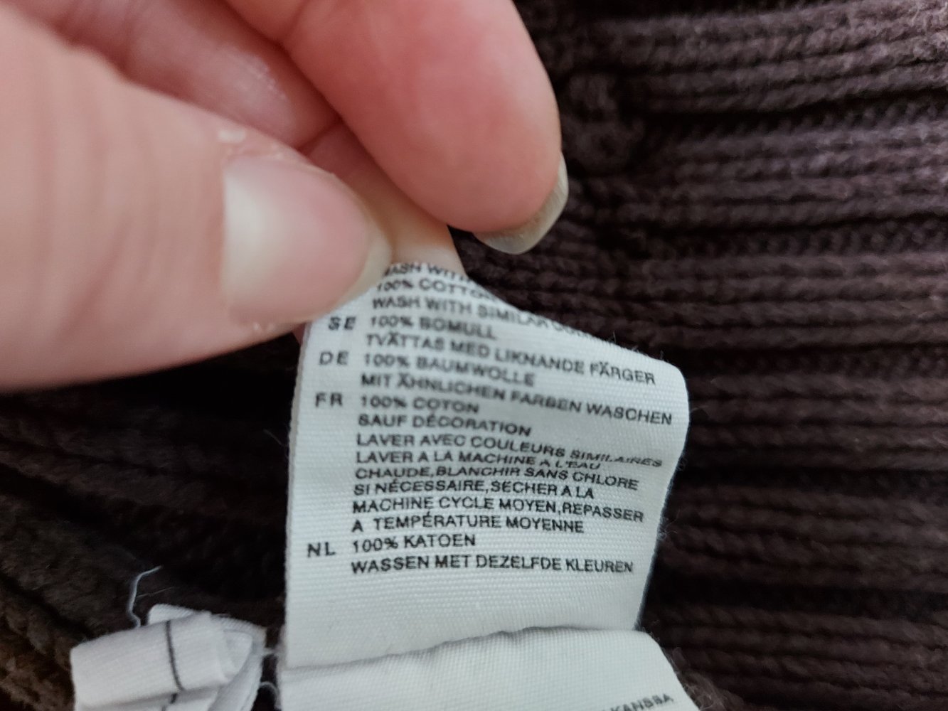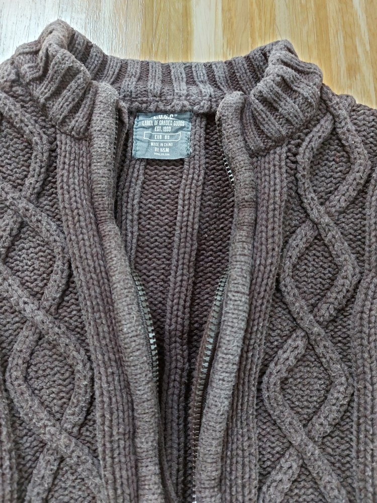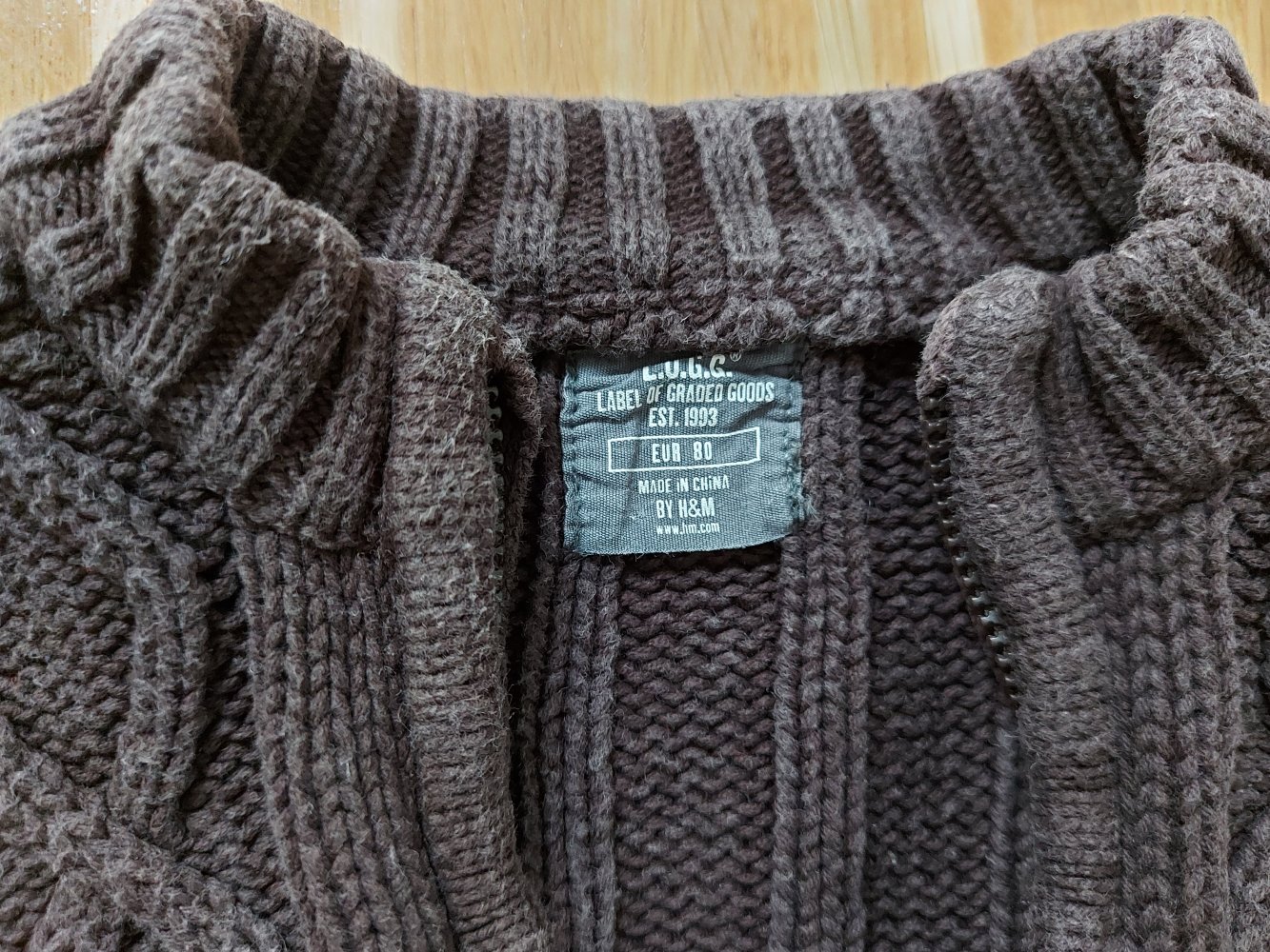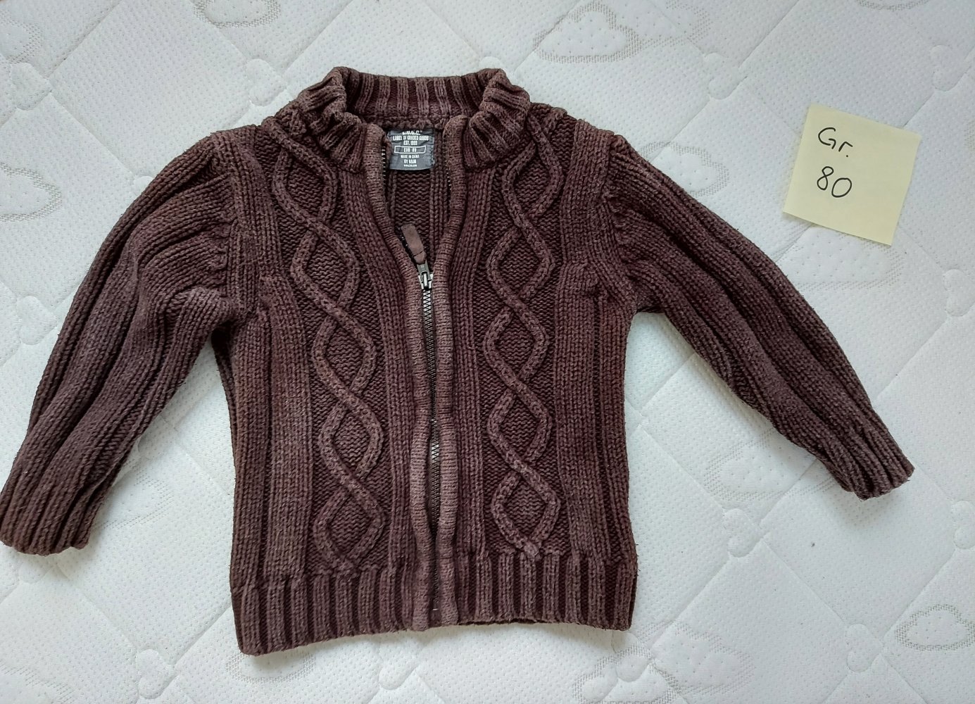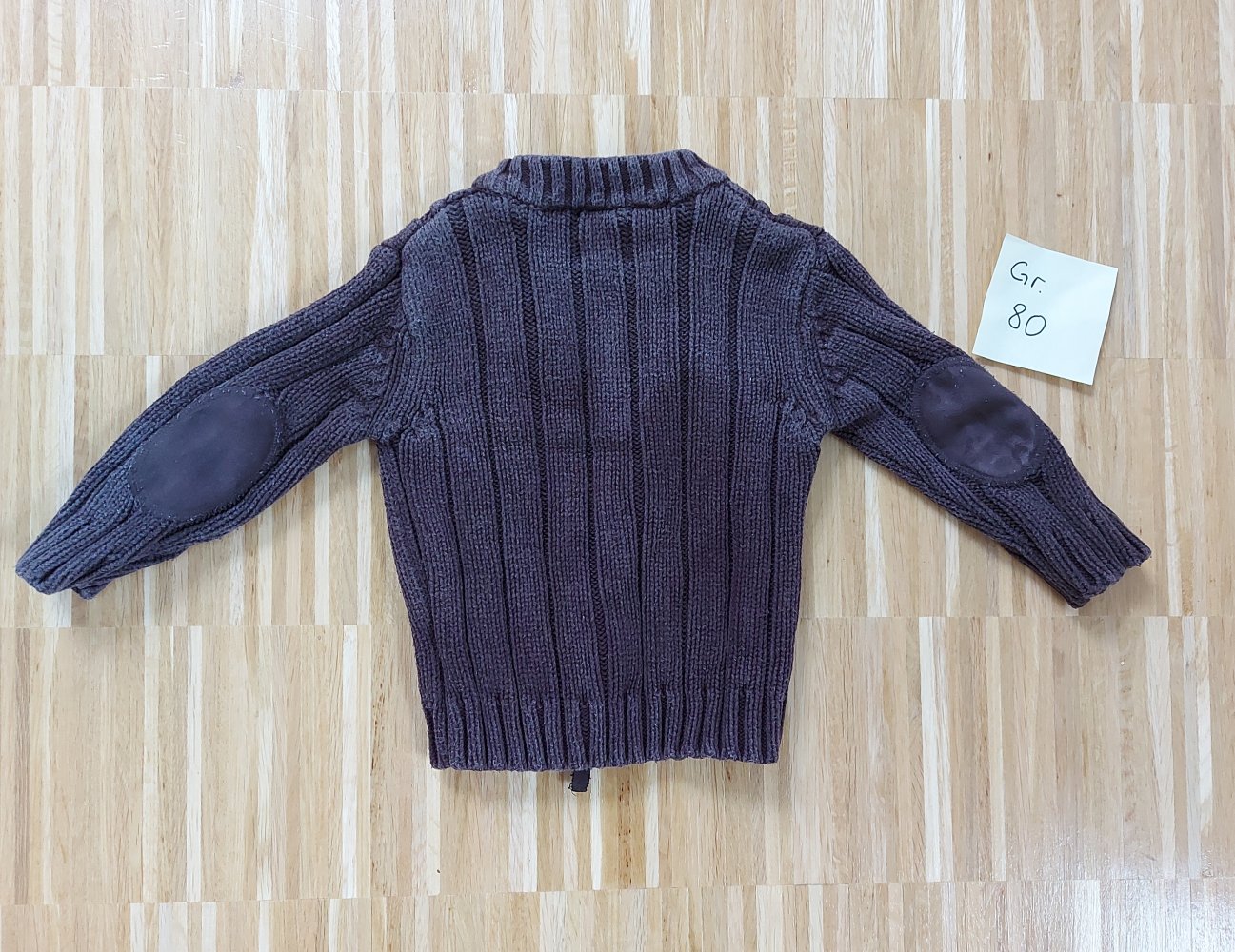 Schöne braune Babyjacke mit Strickmuster und Ellenbogen-Patches. Sie ist schön dick und hält warm (deswegen kann sie leider nicht im Umschlag verschickt werden). Dank des Reißverschlusses ist das An- und Ausziehen ein Kinderspiel und schützt auch besser vor Wind als Knopfleisten.