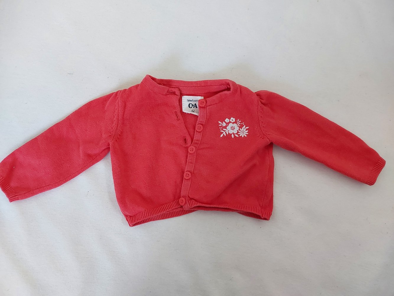 Superniedliche rote Strickjacke mit kleinem weißen Blümchen aus 100 % Baumwolle, Gr. 62.