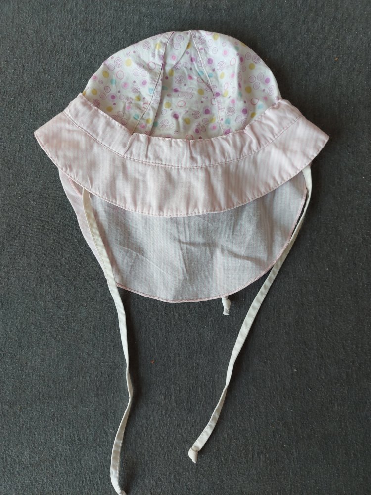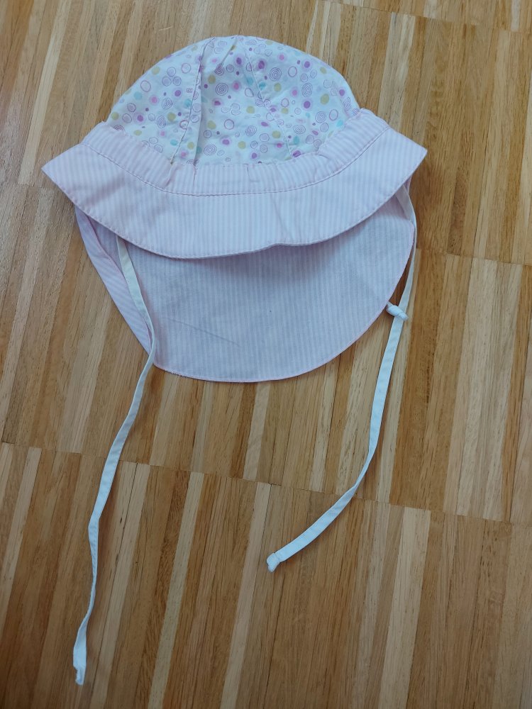 Super niedlicher rosa gemusterter Sommerhut für Babys mit Nackenkrempe Schnüren, damit die Mütze nicht wegrutscht, Gr. 45 aus 100 % Baumwolle.