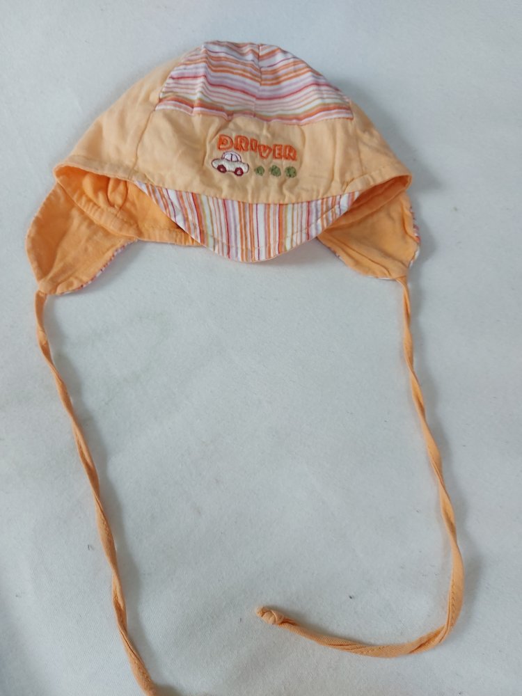 Super niedlicher orangefarbener Sommerhut für Babys, Gr. 50, mit Schnüren, damit die Mütze nicht wegrutscht.