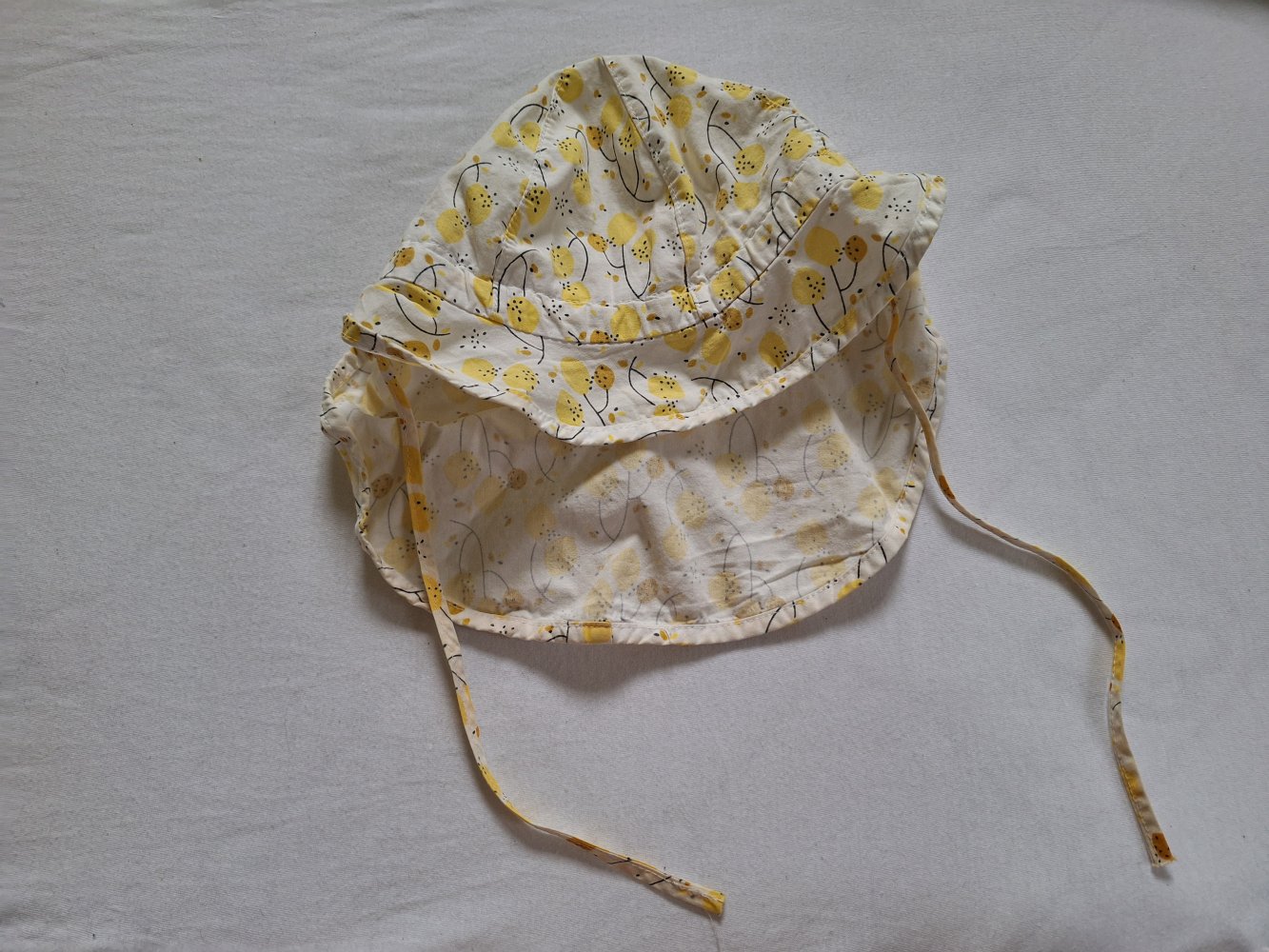 Super niedlicher Sommerhut mit Zitronenmuster von Pusblu für Babys, Gr. 48/49, mit Schnüren, damit die Mütze nicht wegrutscht.