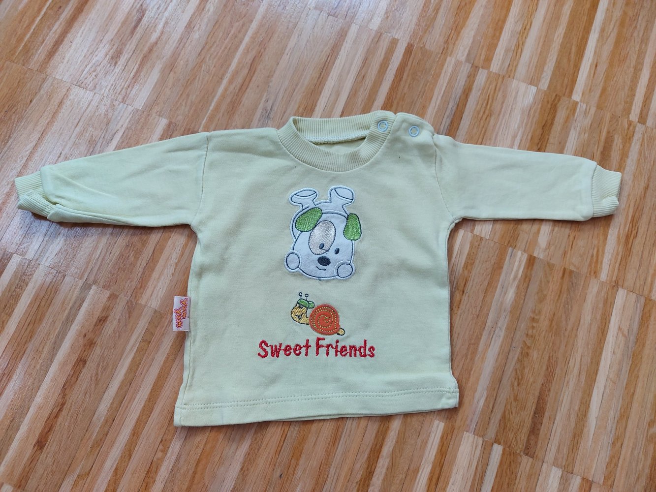 Niedlicher zitronengelber Langarmpullover für Babys, Gr. 62 aus 100 % Baumwolle. Am Halsausschnitt befinden sich 2 Druckknöpfe, um den Pullover leichter über den Kopf an- und auszuziehen. Es steht keine Größe drin, müsste ca. Gr. 62 entsprechen.