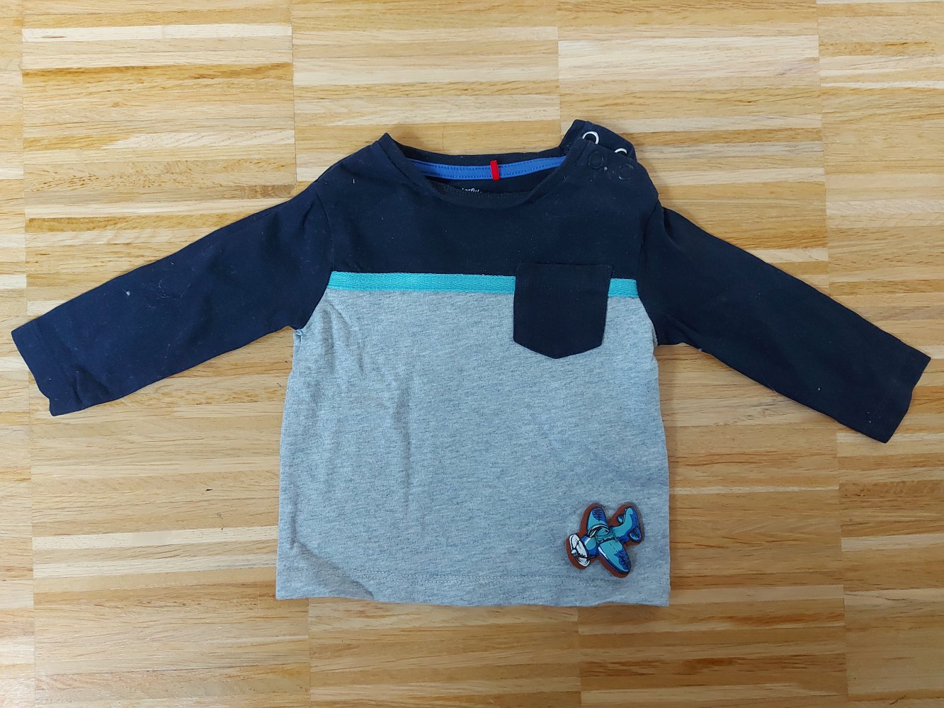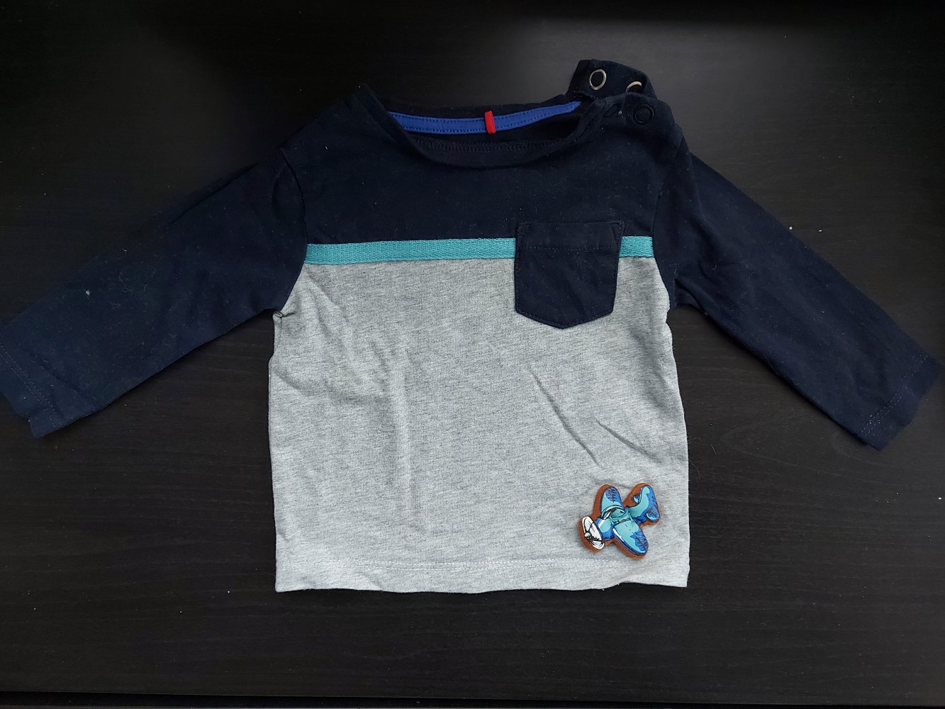 dunkelblau-grauer Babypullover mit kleinem Flugzeug von s.Oliver, Gr. 62