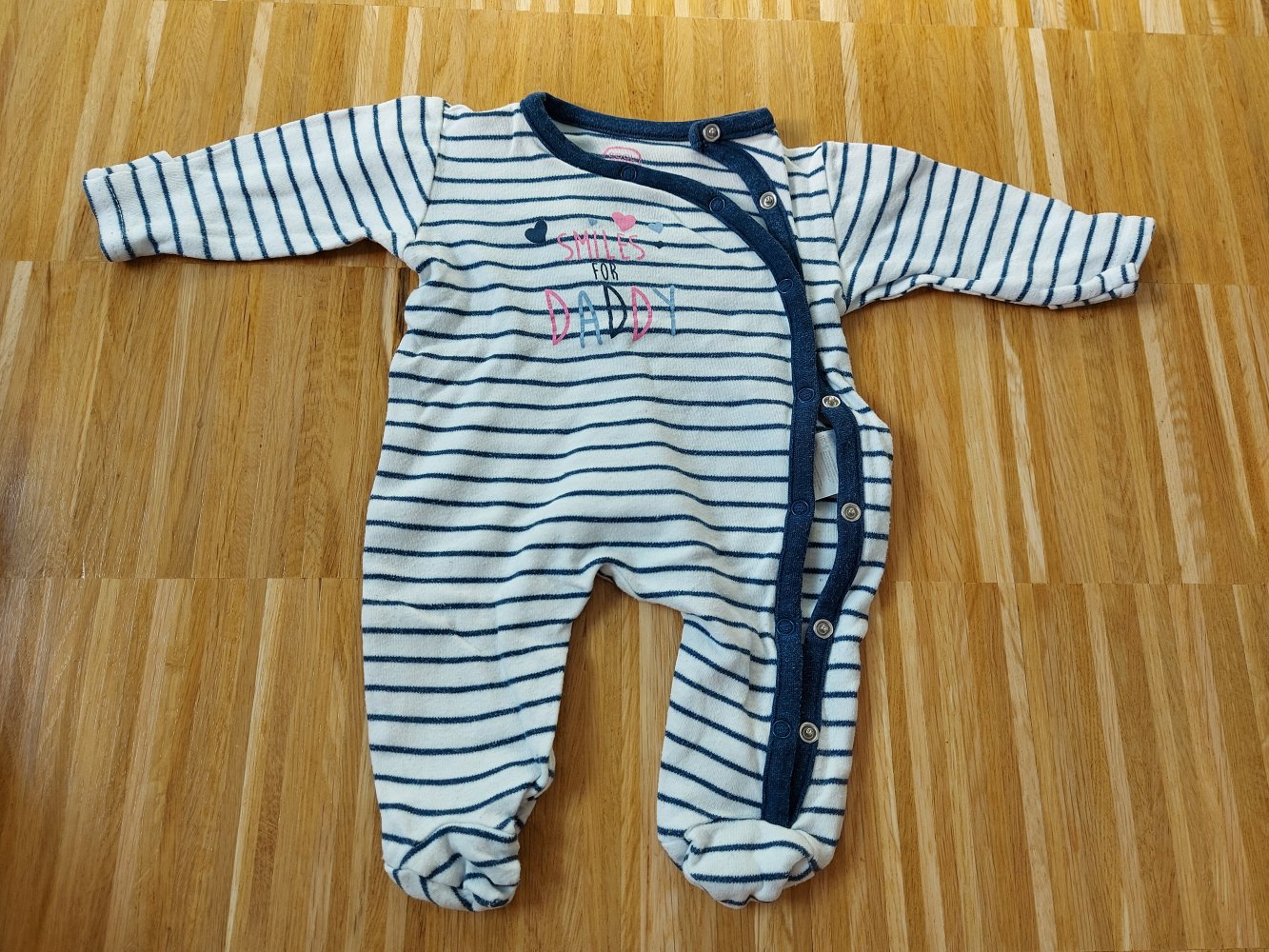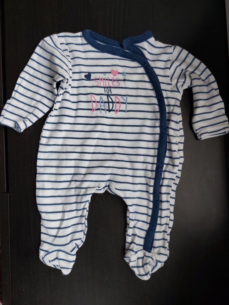 Weißblau-gestreifter Babypyjama mit der süßen Aufschrift "smiles for daddy" in Gr. 56. Mit praktischen Druckknöpfen (so stört kein Reißverschluss am Hals) und mit Füßchen - sehr praktisch, denn auch bei einem starken Bewegungsdrang verrutschen dadurch quasi nicht die Söckchen.