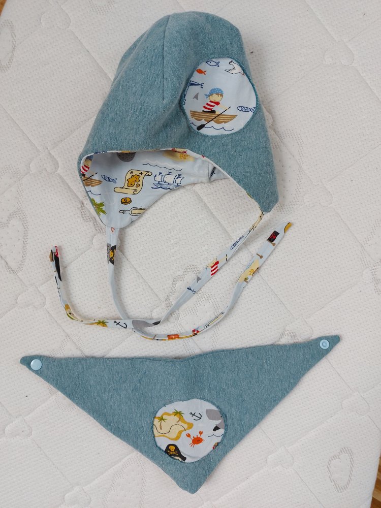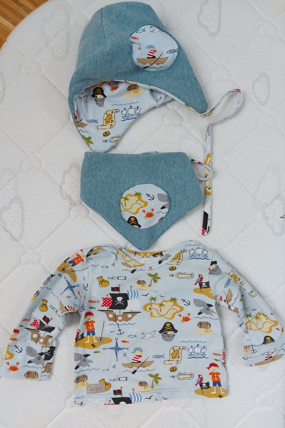 Supersüßes hellblauer Set für Babys mit niedlichen bunten Piratenmotiven. Der Pullover hat einen weit dehnbaren amerikanischen Ausschnitt, um den Pullover leichter über den Kopf an- und auszuziehen. Dreieckstuch und Mütze passen perfekt zusammen, das Halstuch ist mit einem Druckknopf zu schließen, die Mütze schützt und wärmt die Ohren und ist mit Bändern am Hals zu schließen.