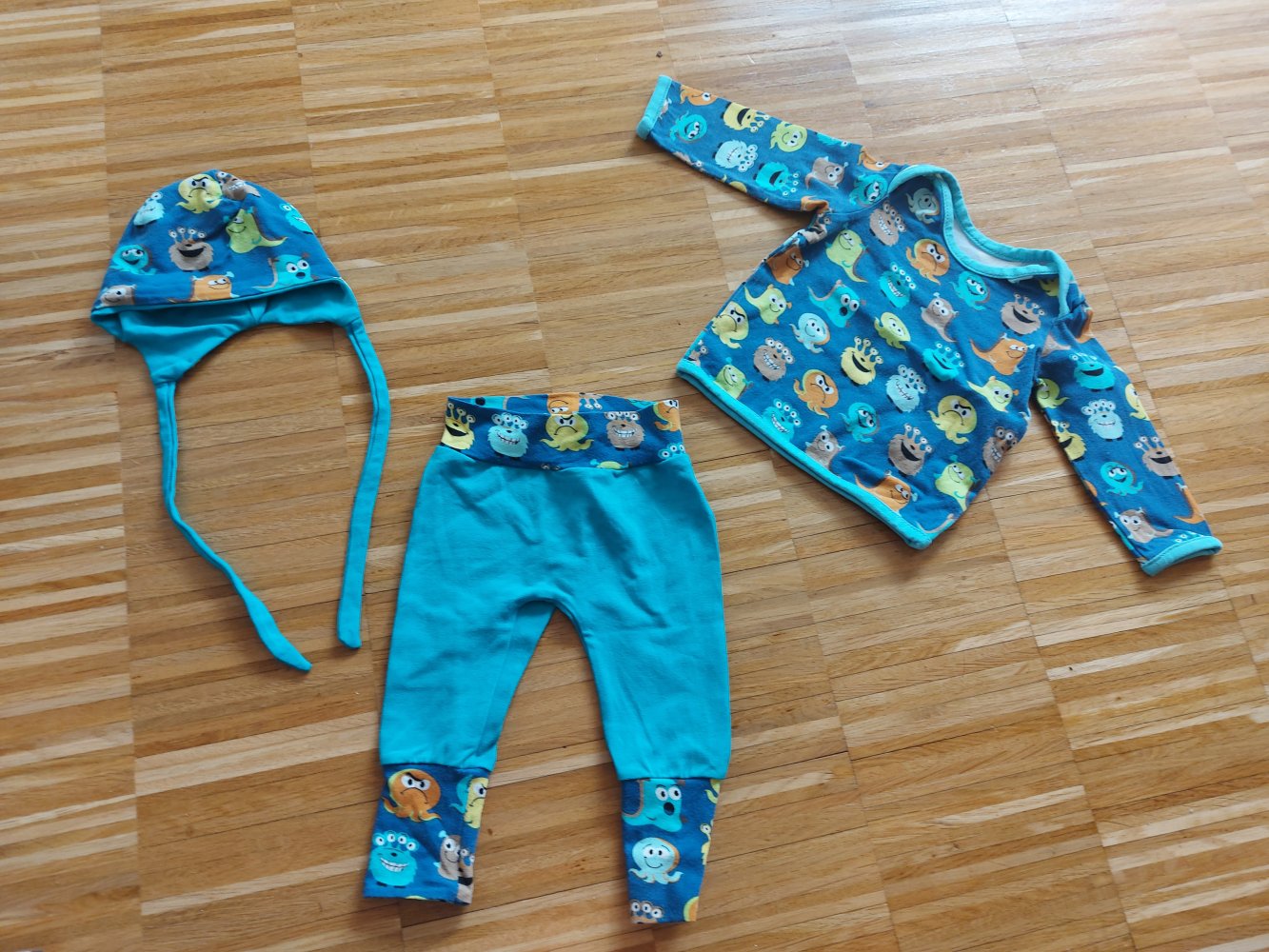 3-teiliges Set: blauer Pullover, Hose und Mütze mit Monstermotiven