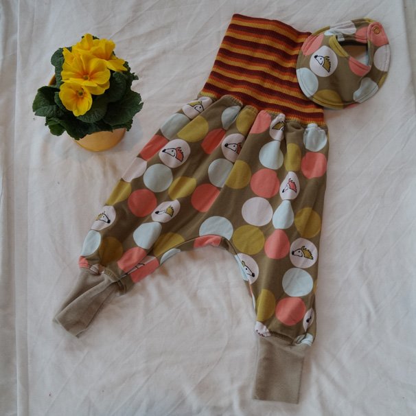 Dieses Set besteht aus einer aus kbA Baumwolle genähten Pumphose, welche mitwächst und einem Wende-Halstuch.