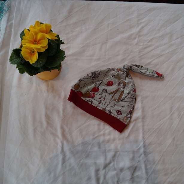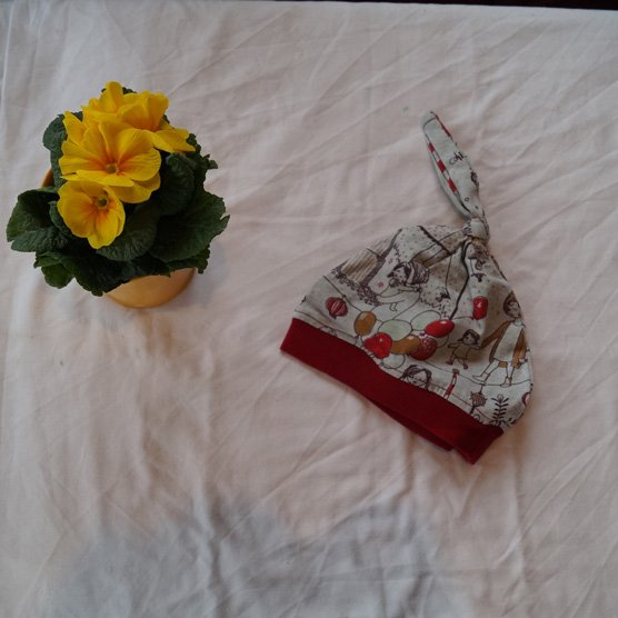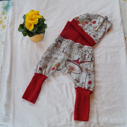 Wunderschönes Set für das frisch geborene Baby bestehend aus einer mitwachsenden Pumphose, welche ein hohes Bauchbündchen und krempelbare Beinbündchen hat und einem lustigen Zipfel-/Knoten-Mützchen.