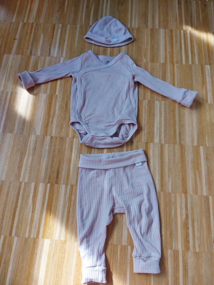 Super niedliches 3-teiliges geripptes altrosa Bekleidungsset bestehend aus Wickelbody, Hose und Mützchen in Gr. 74 aus 100% Baumwolle.