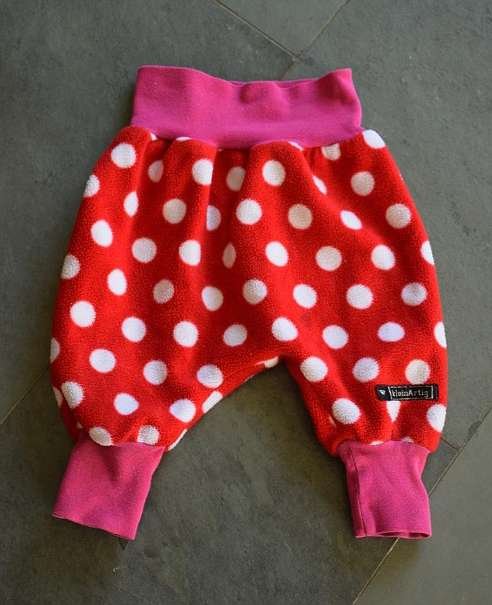 Süße, warme Fleecekombi (Pumphose und Oberteil) mit Punkten zum Mitwachsen. (Größe 62-68 cm). Sehr guter Zustand!