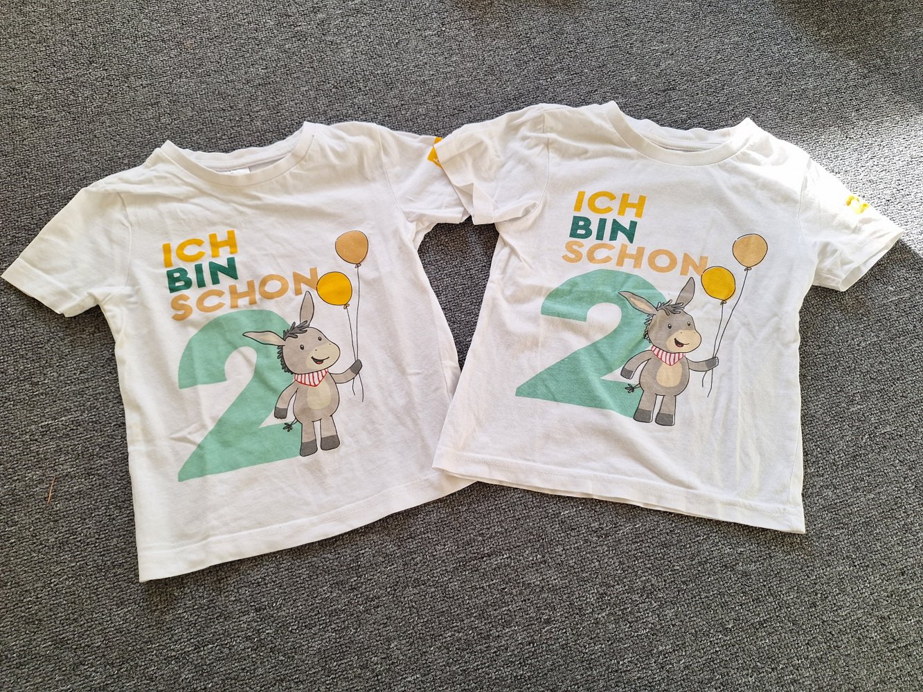 2 niedliche T-Shirts ab dem 2. Geburtstag "Ich bin schon 2" mit Esel. Gr. 98/104, fällt aber nicht größer aus als 92/98. Ideal für Zwillinge. 100 % Baumwolle