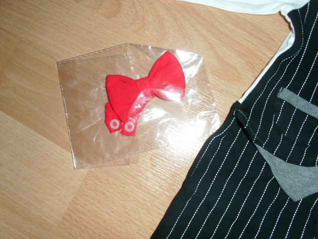 Biete hier einen ganz süßen Einteiler / Anzug in Größe 62/68 an. Vorn vorn sieht es aus wie ein Dreiteiler, aber alle Teile sind miteinander vernäht. Oben befindet sich ein wollweißer Pulli mit Kragen und Knöpfen. Darüber befindet sich vorn eine kleine schwarz gestreifte Weste mit Knöpfen und Taschen. Die anschließend schwarz gestreifte Hose lässt sich im Schritt öffnen für ein leichtes Wickeln. Dazu gehört noch eine rote Fliege, welche noch verpackt ist. Der Einteiler / Anzug ist neu und ungetragen. Es war ein Geschenk, aber es war leider schon zu klein.