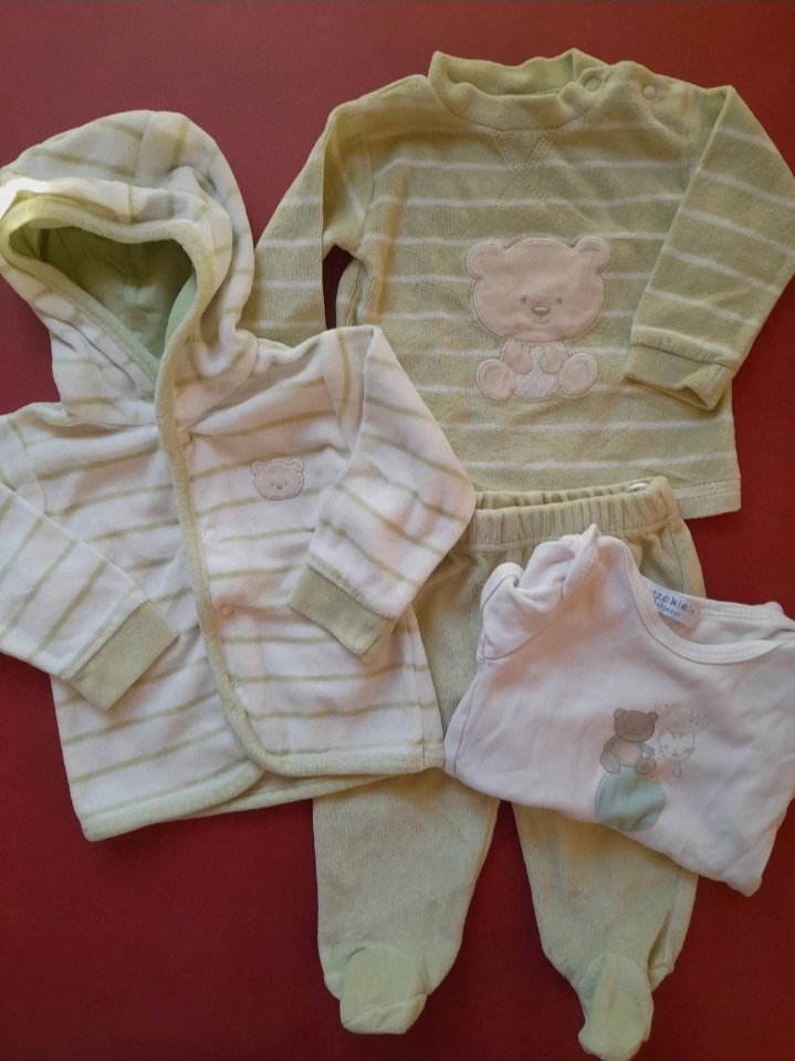 Ich verkaufe das Set "Bärchen im Grünen" bestend aus einem süßen gestreiften Bärchen Jäckchen, einem Bärchen Pullover, einer grünen Hose mit Füßen und einem Body mit Bärchen und Katze (von Klitzeklein) in Größe 62 für Jungs oder Mädchen. Der Body ist etwas verwaschen.