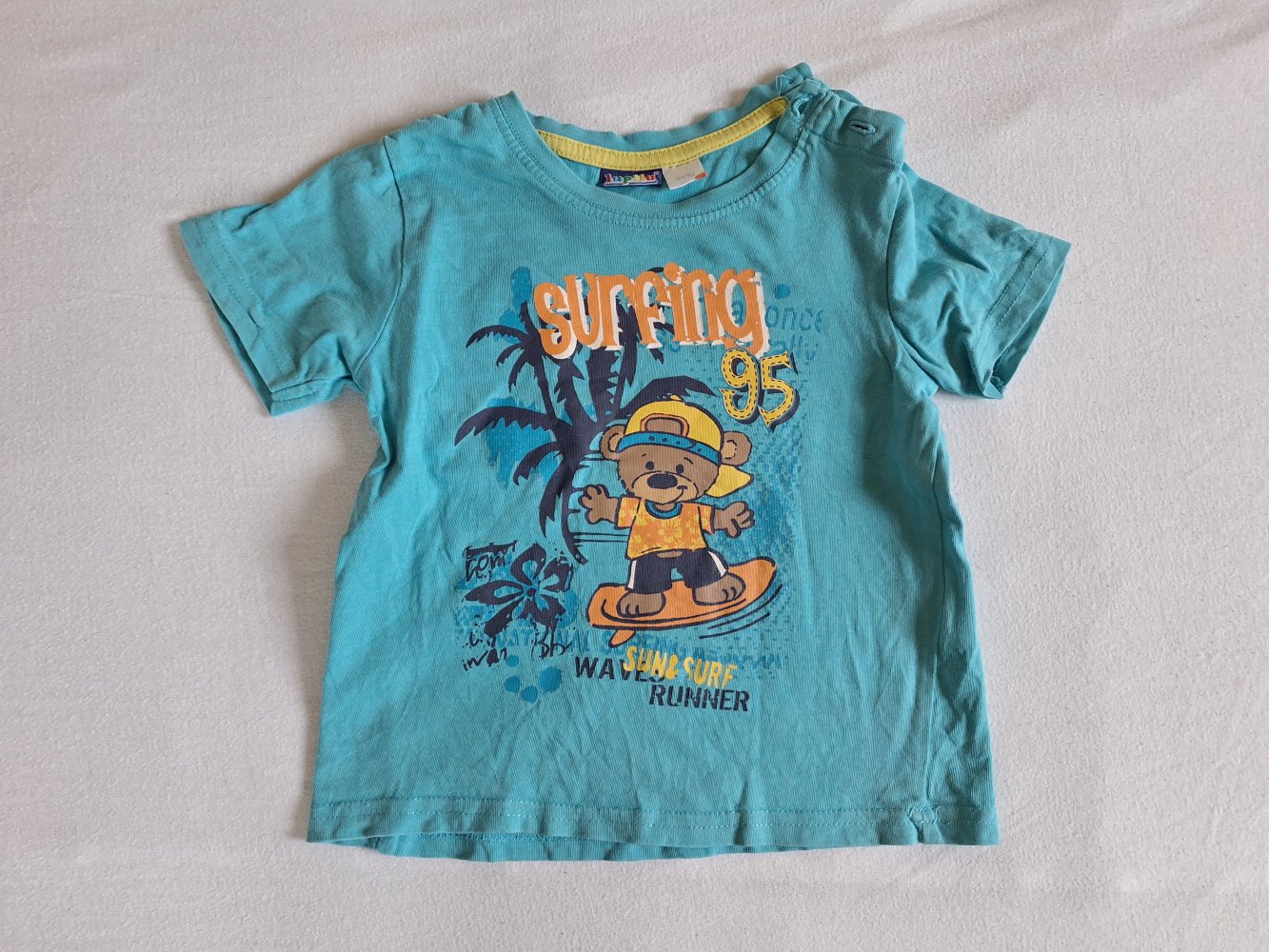 Kurzärmliges türkises T-Shirt mit surfendem Bärchen aus 100% Baumwolle. Am Halsausschnitt befinden sich 2 Knöpfe, um das Shirt leichter über den Kopf an- und auszuziehen. Sieht super niedlich aus.