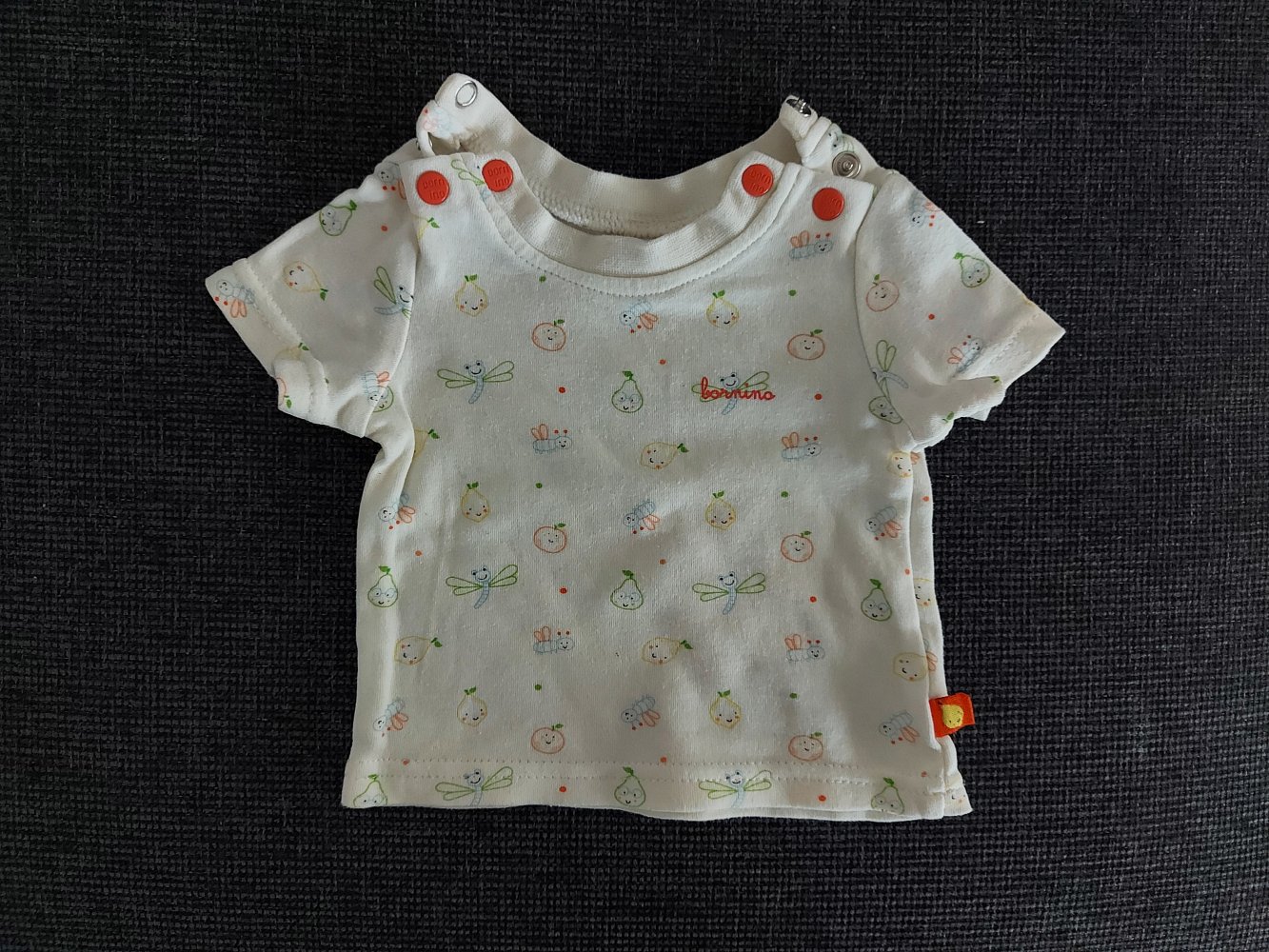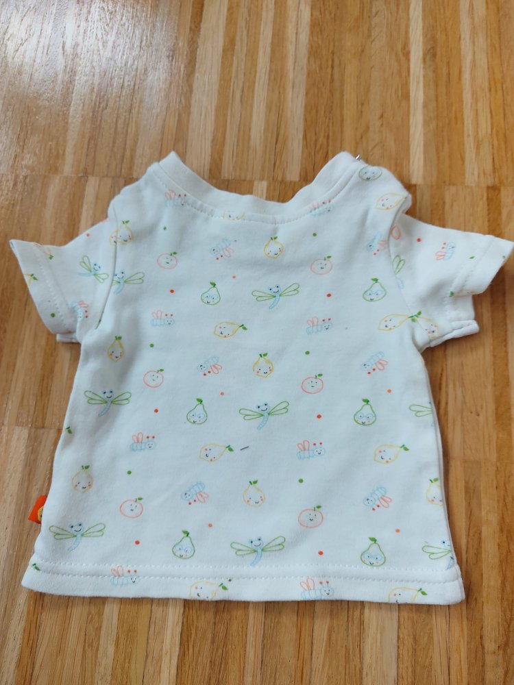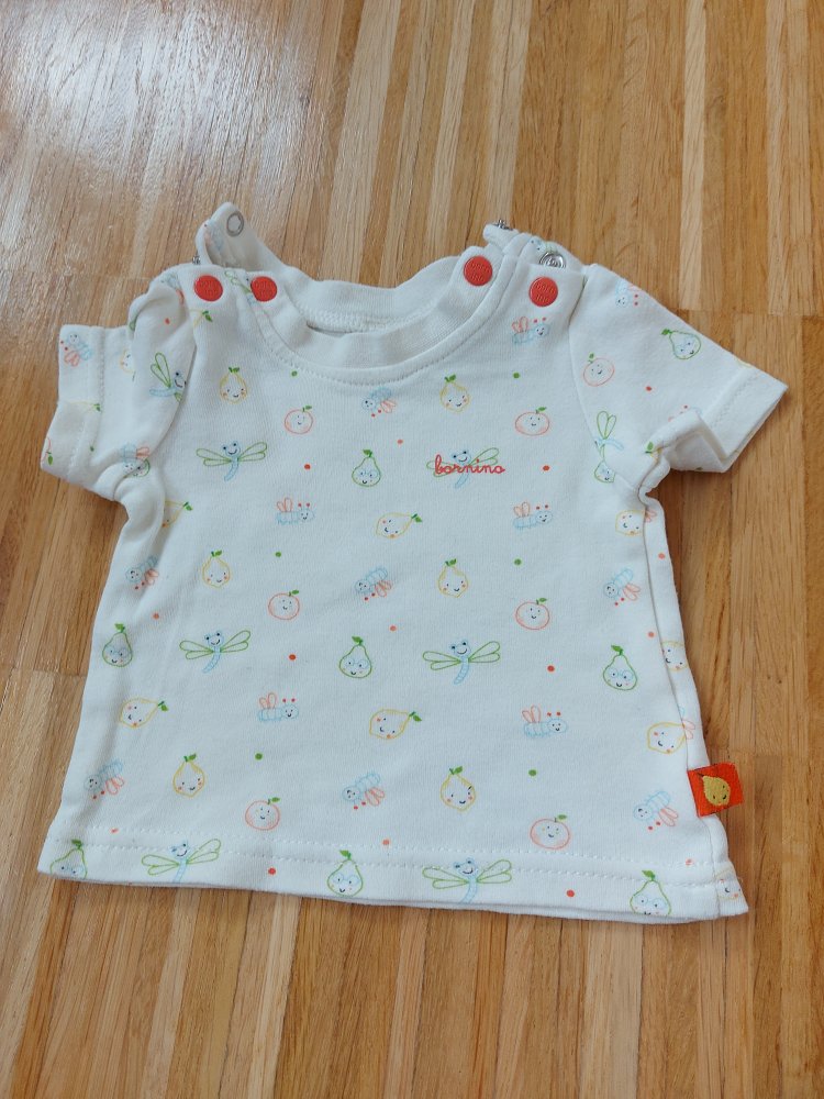 Super niedlicher Baby-T-Shirt, Gr. 50/56 mit süßen Obstmotiven aus 100 % Baumwolle. Am Halsausschnitt befinden sich auf jeder Seite 2 Druckknöpfe, um das Shirt leichter über den Kopf an- und auszuziehen.