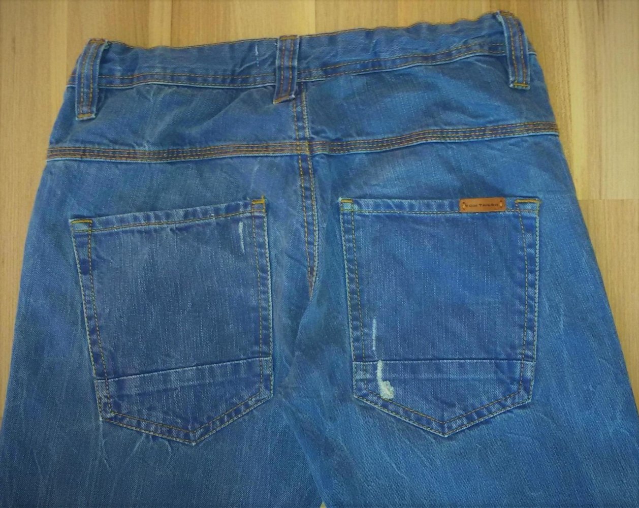 Die Hose wurde getragen und ist an einem Knie leicht fleckig (Bild). Ansonsten ist sie noch in einem guten Zustand. Sie ist von Tom Tailor, das Modell Paul.
