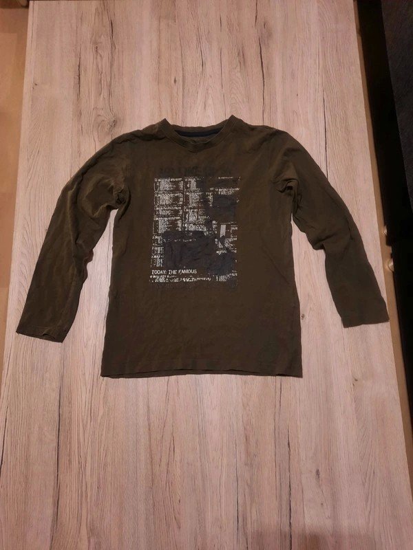 Aufdruck etwas rausgewaschen, Größenschild bzw Markenschild rausgeschnitten: nach bestem Gewissen Größe festgelegt und Marke bestimmt. Vergleichsfoto: blauer Pullover Größe 134/140.