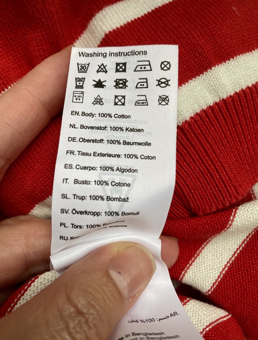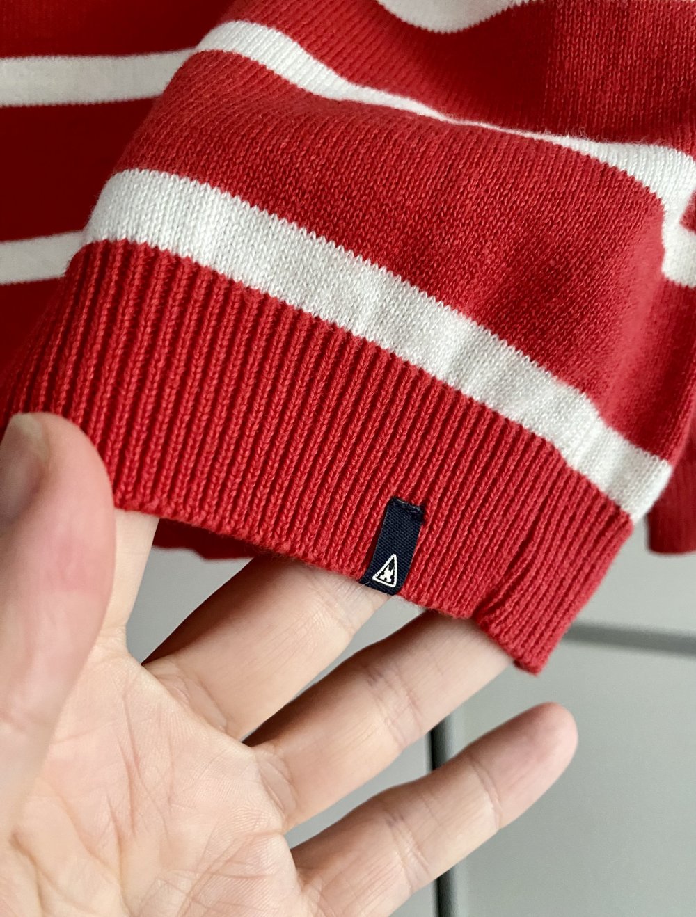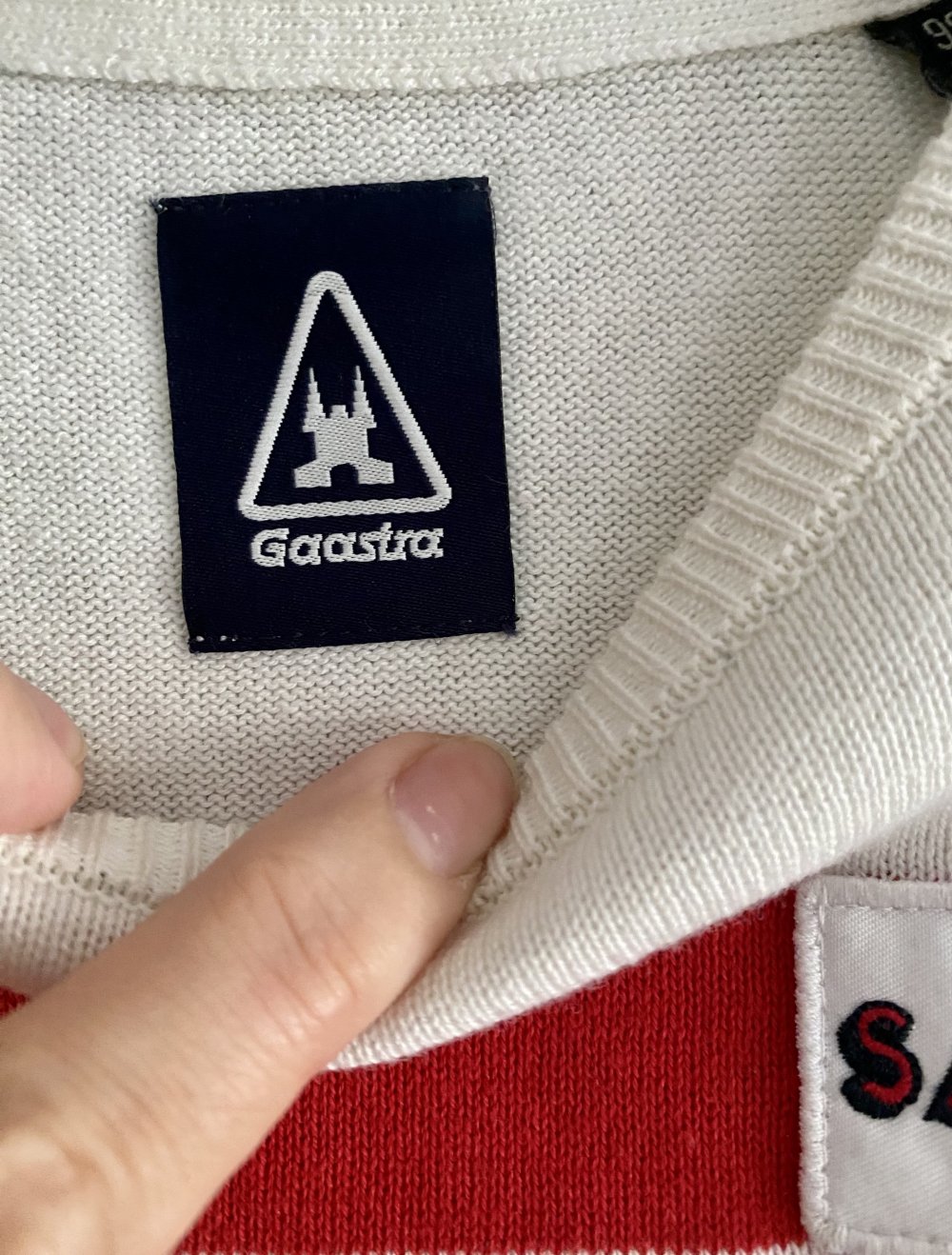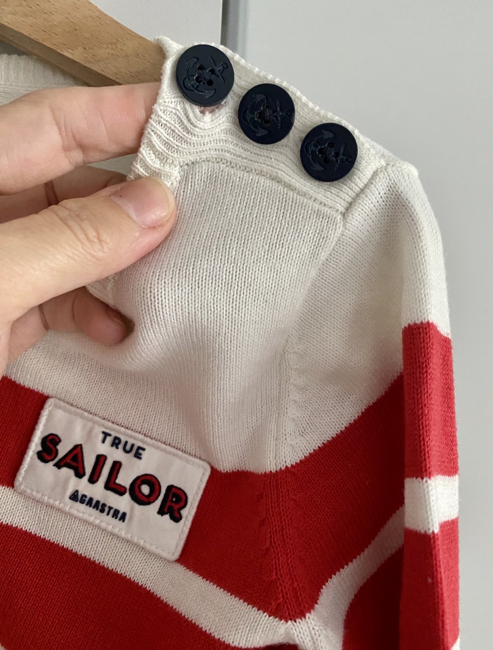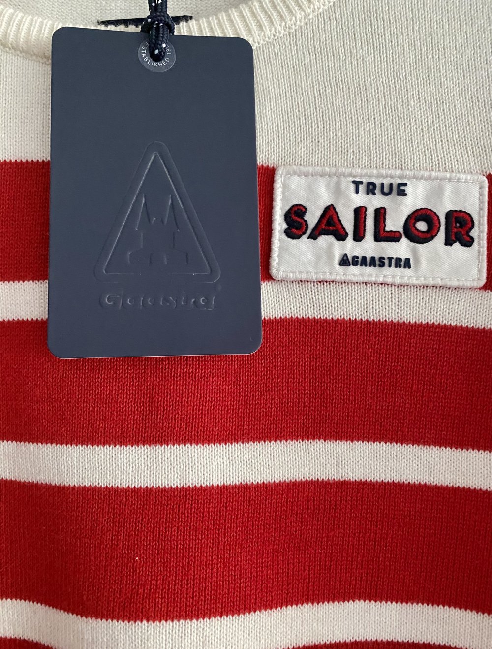 Der Pullover ist rot-weiß gestreift und hat einen Aufnäher mit dem Schriftzug "True Sailor Gaastra". Auf den Schultern befinden sich drei Knöpfe mit Ankermotiven. Der Pullover ist neuwertig. Aus 100 % weicher Baumwolle. Die Größe fällt normal aus. NP 79,95 €.