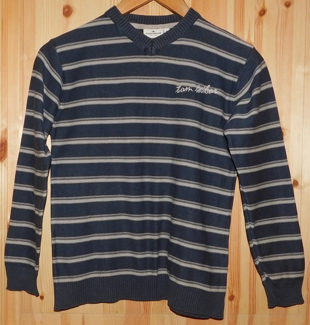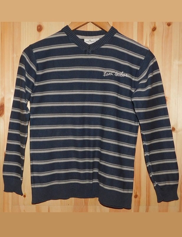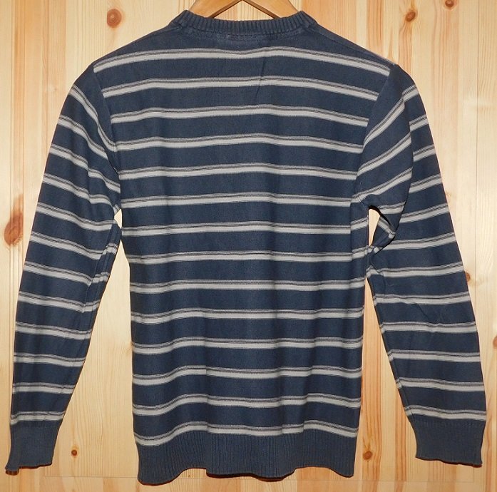 Gr.M (entspricht Gr.152) Feinstrick-Pullover grau blau gestreift