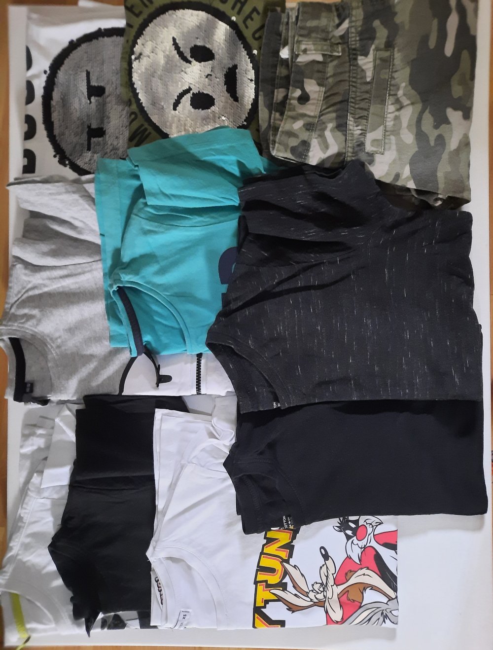 besteht aus 9 t shirts und einer shorts