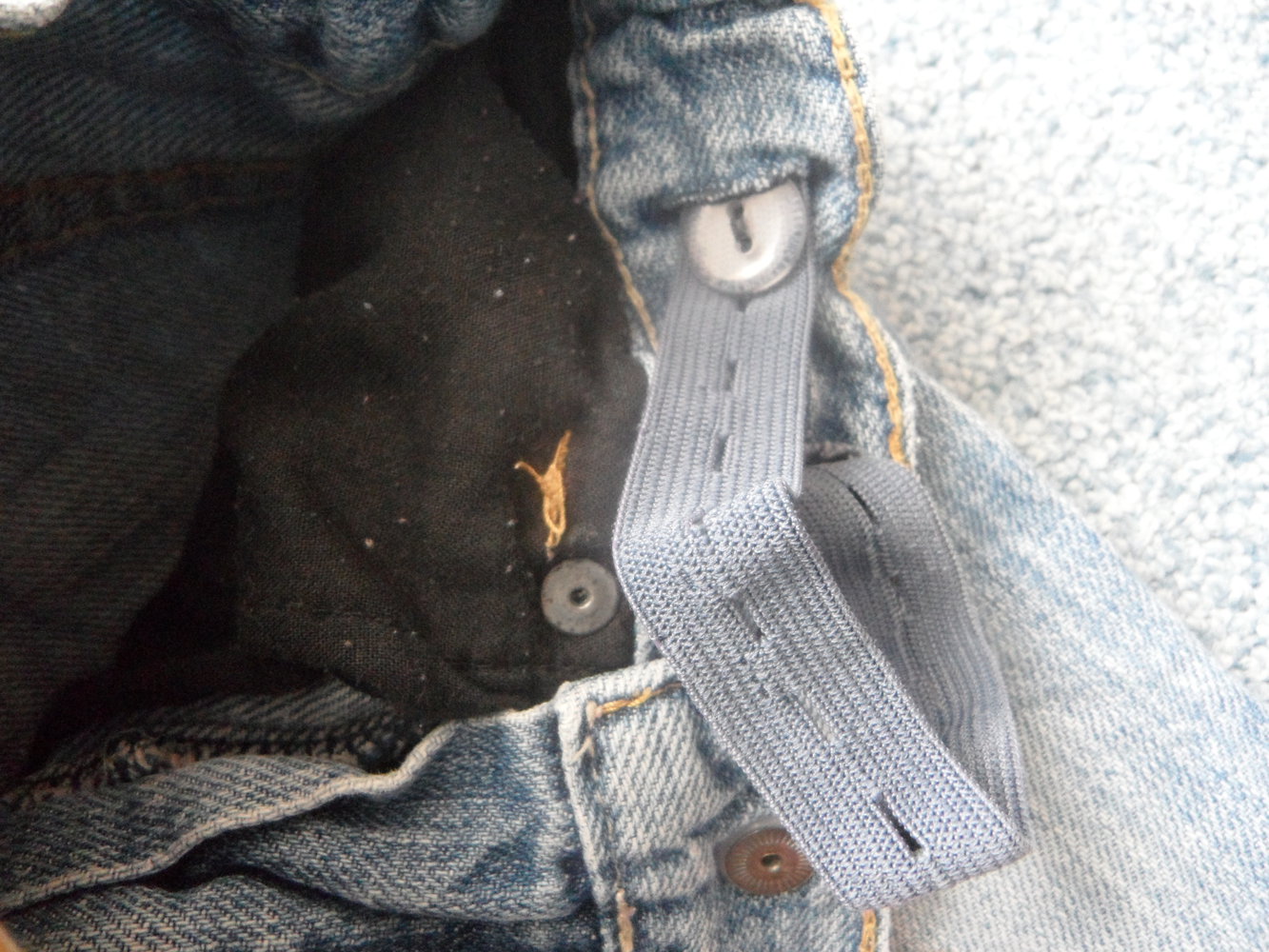 schöne Jeans mit verstellbarem Gummizugbund für schlanke Mädchen. Unten an den Beinen der Saum ist abgewetzt, außerdem "used" (Waschspuren vorhanden). Knie intakt.