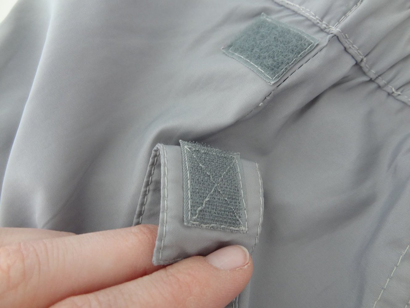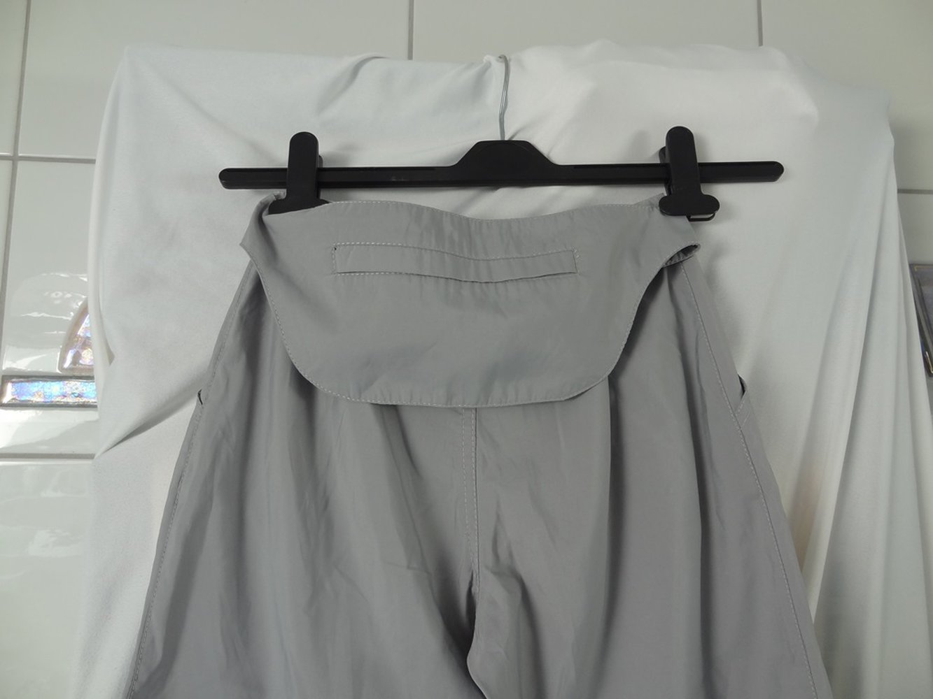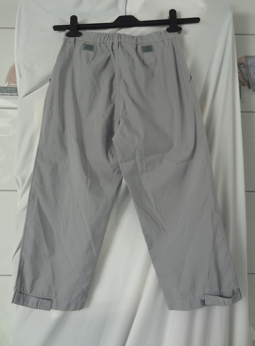 Leichte graue Stoffhose in Größe 152. Sie hat Zwei Vordertaschen und wird mit einem Klettverschluss und einem Reißverschluss geschlossen. In ca. Kniehöhe hat sie eine Naht. Sie hat Gürtelschlaufen. Auf der Rückseite an den Beinenden hat sie auf jeder Seite ein Bändel mit einem Klettverschluss, womit man die Enden etwas enger machen kann. Sie hat eine dazupassende Bauchtasche, die man mit einem Klettverschluss hin- oder abmachen kann. Man kann die Bauchtasche nach vorne oder hinten hängen lassen.