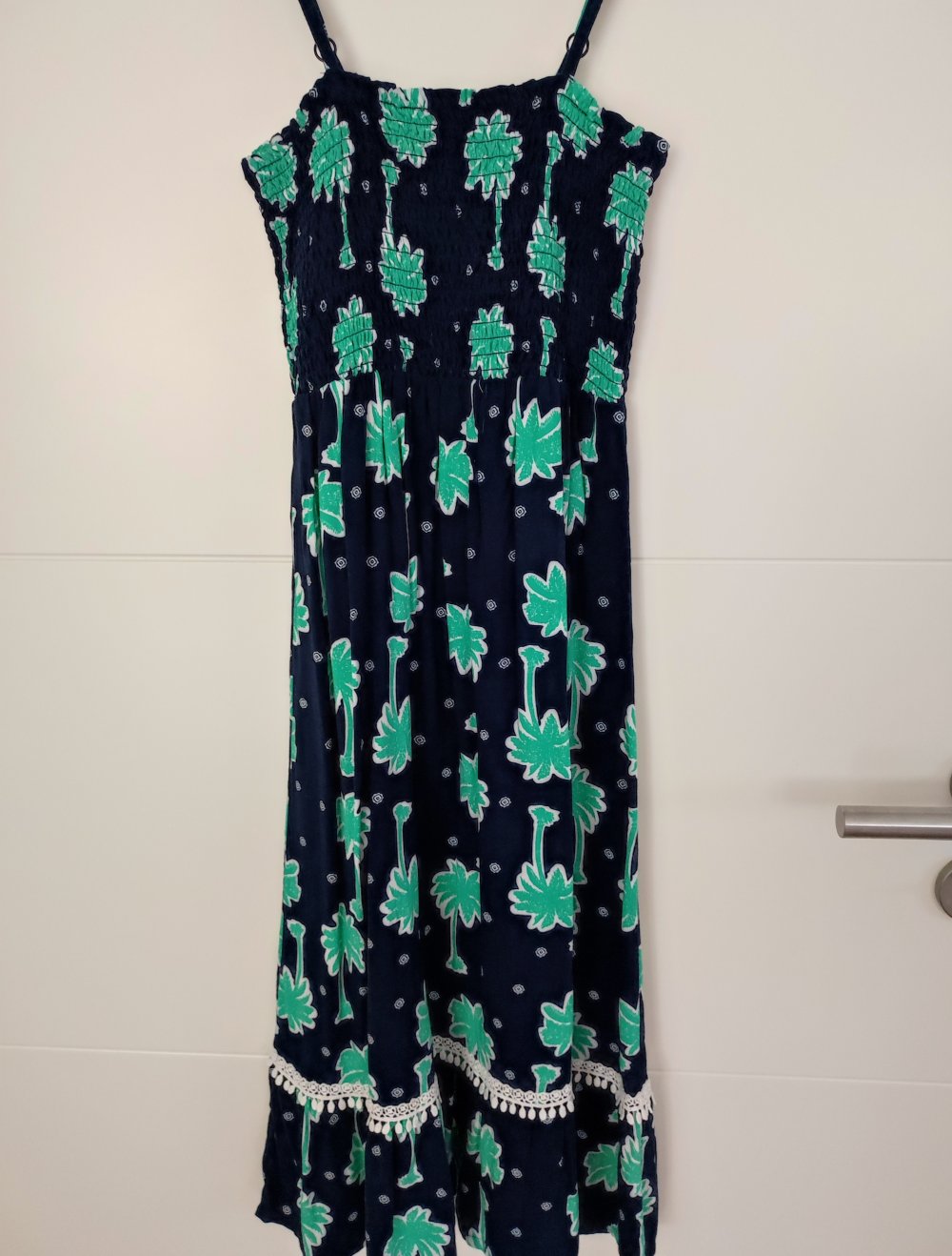 ungetragenes, blau gemustertes Trägerkleid in Gr. 140
