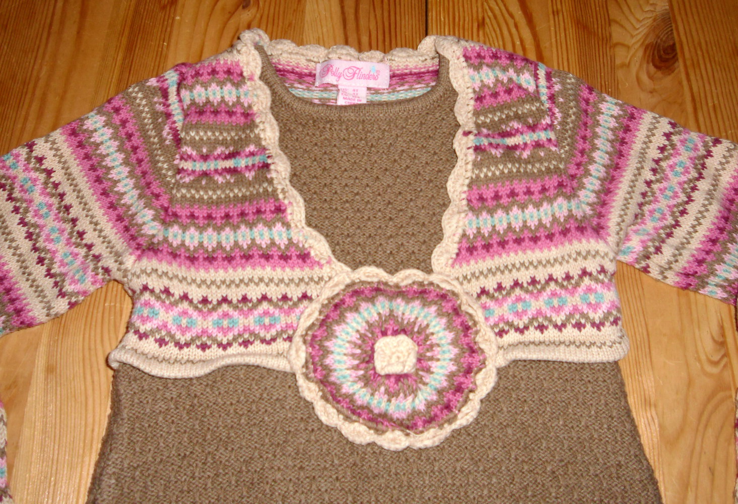 ein ganz tolles Strickkleidchen uas USA, in einem so helleren braunton mit schönem Strickmuster , oben sieht es aus als wäre ein Jäckchen darüber, vorne mit großer Blüte,ist aber nagnäht. es wurde getragen ist abe rin ordnung, kein Peeling etc..Nichtraucherhaushalt haben aber Samtpfoten als Mitbewohner