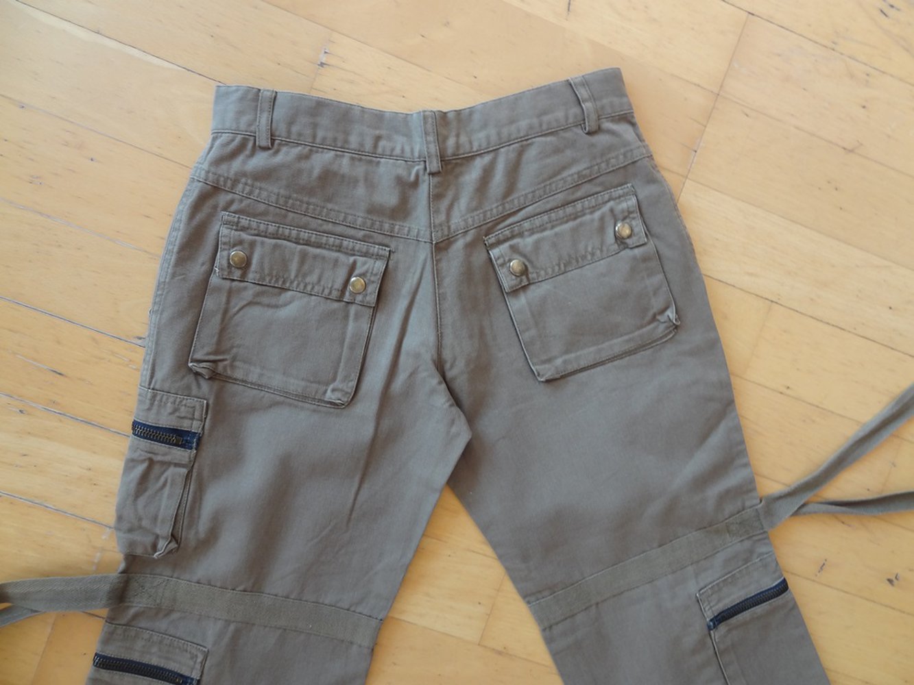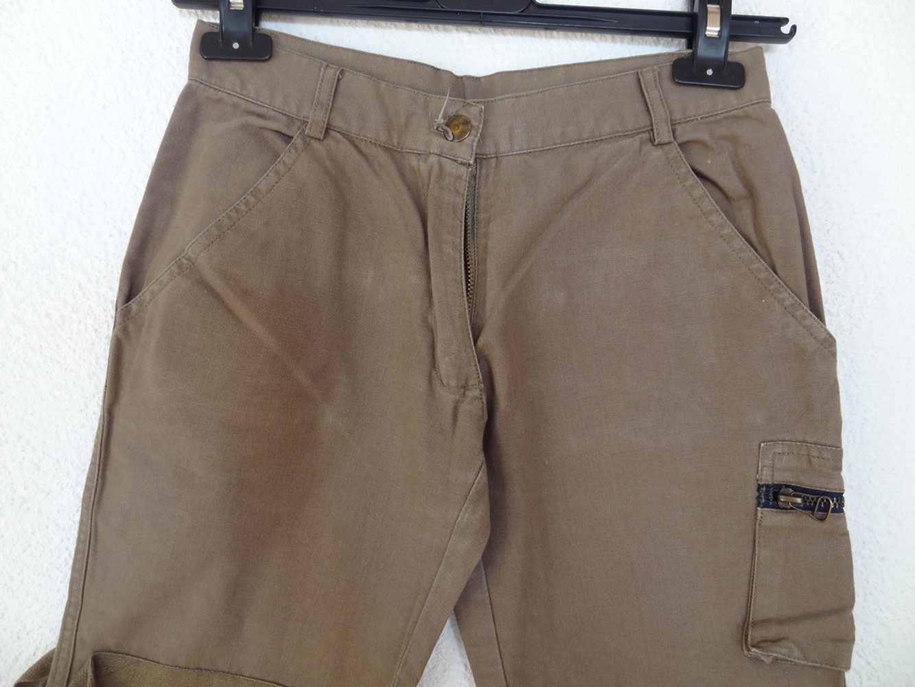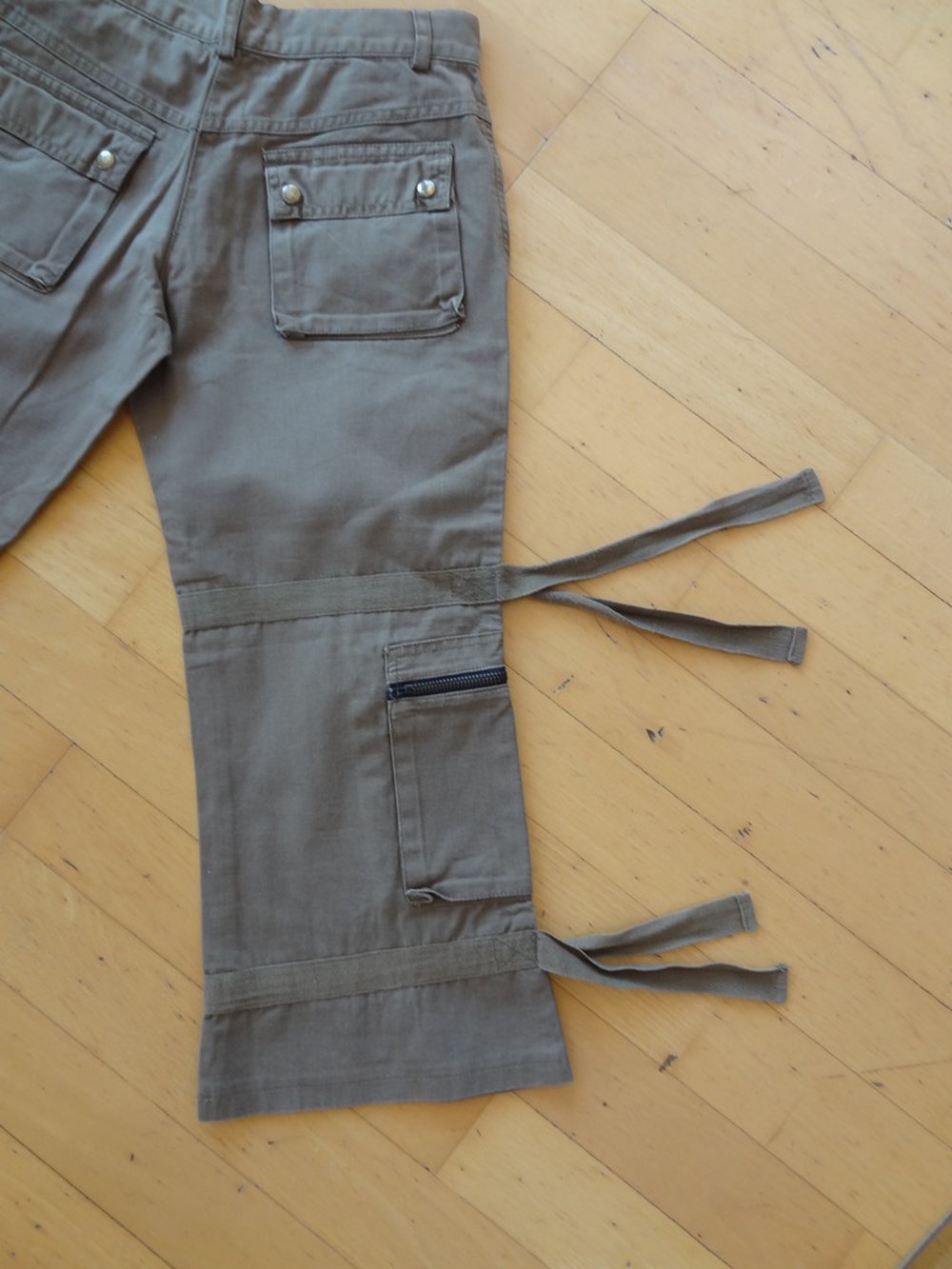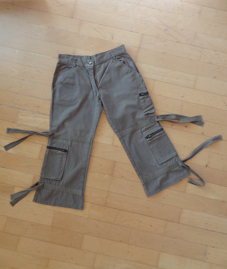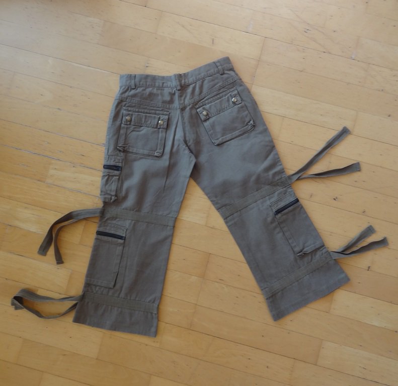 Schöne 3/4 Hose in der Größe 146. Sie hat 2 Vordertaschen und wird mit einem Knopf und einem Reißverschluss geschlossen. Auf Schenkelhöhe hat sie auf der linken Seite eine Tasche mit Reißverschluss, auf Kniehöhe hat sie auf beiden Seiten Bändel, die seitlich verlossen werden können oder offen gelassen werden können und weiter unten hat sie auch auf beiden Seiten zwei größere Taschen mit Reißverschluss, sowie etwas darunter nochmals auf beiden Seiten zwei Bändel. Hinten sieht man ebenso alle 3 Taschen mit Reißverschluss und die Bändel. Zusätzlich hat sie zwei Potaschen mit Druckknöpfen. Sie hat Gürtelschlaufen. Farbe ist dunkelgrün/ khaki oder auch etwas graugrün. Das Knopfloch ist etwas ausgefranst.