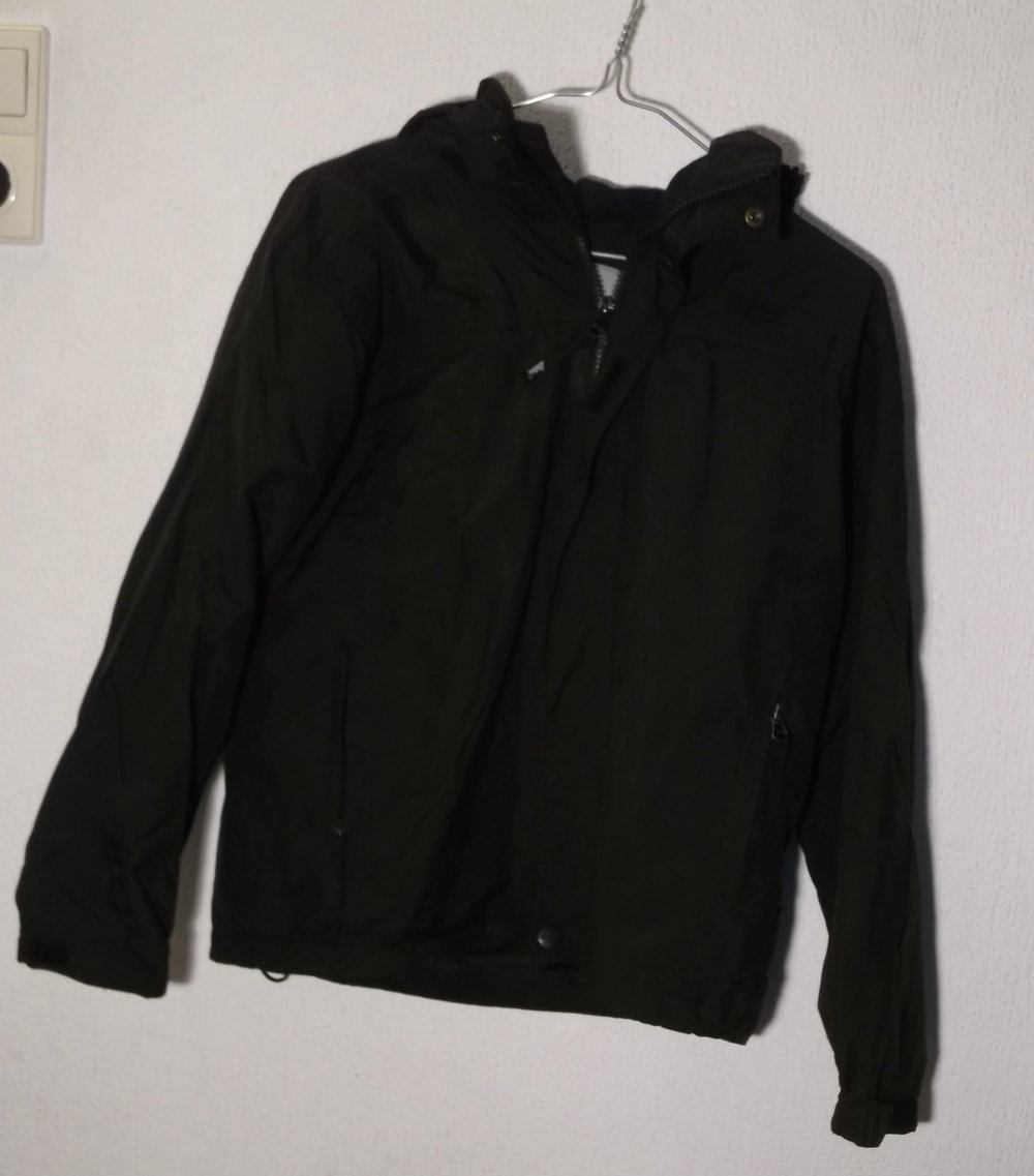 schwarze Regenjacke mit Kapuze von High Colorado in der größe 152 (kindergröße) ich trage 34-38 und mir passt sie gut würde sie für 32-36 empfehlen. Sie ist atmungsaktiv, Wind- und regendicht, wurde oft getragen ist aber noch im gutem Zustand allerdings müsste die Imprägnierung auf den Schultern mal erneuert werden. Sie lässt sich in der Taille in der größe einstellen, super für alle Outddor aktivitäten. Die Kapuze lässt sich bei nichtgebrauch entweder einrollen und im Kragen vertauen oder mitteles verdecktem reissverschluss abnehmen. Sie hat 2 geräumige taschen aussen und eine Innentasche. Neu hat die Jacke etwa 120 Euro gekostet