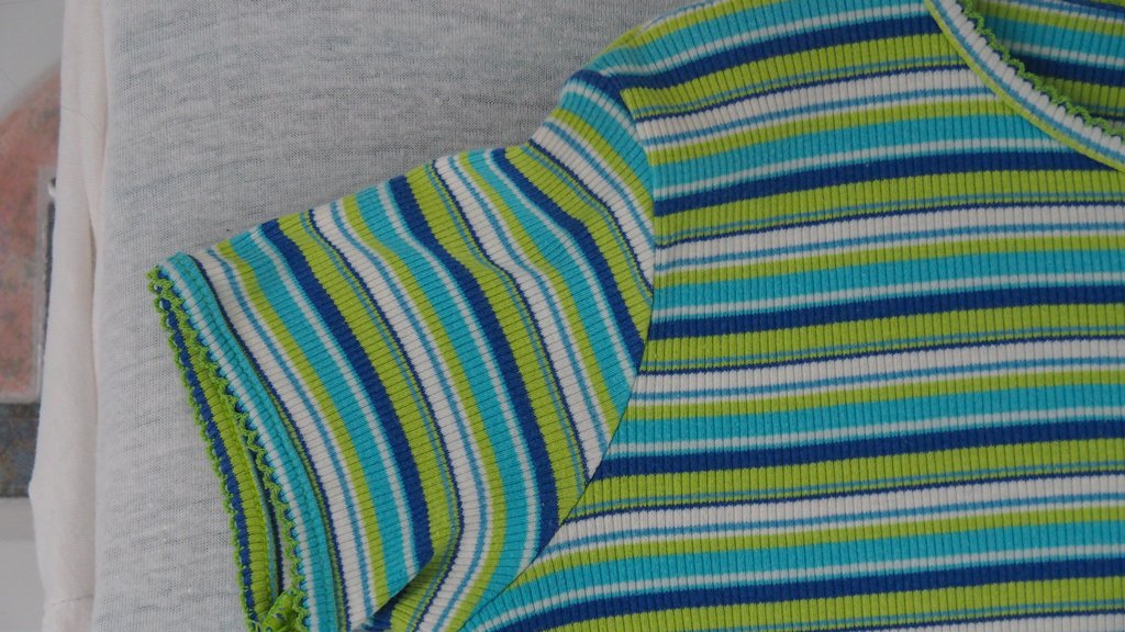 Schönes frühlingshaftes gestreiftes T-Shirt von United Colors of Benetton. Es hat waagrechte Streifen in weiß, grün, hell- und dunkelblau. Größenangabe ist XL das entspricht circa der Kindergröße 152 mit einer Körpergröße von ca. 150cm. Am Rundausschnitt und an den Ärmeln hat das T-Shirt kleine Rüsschen in grün. Die Naht ist leicht verrutscht.