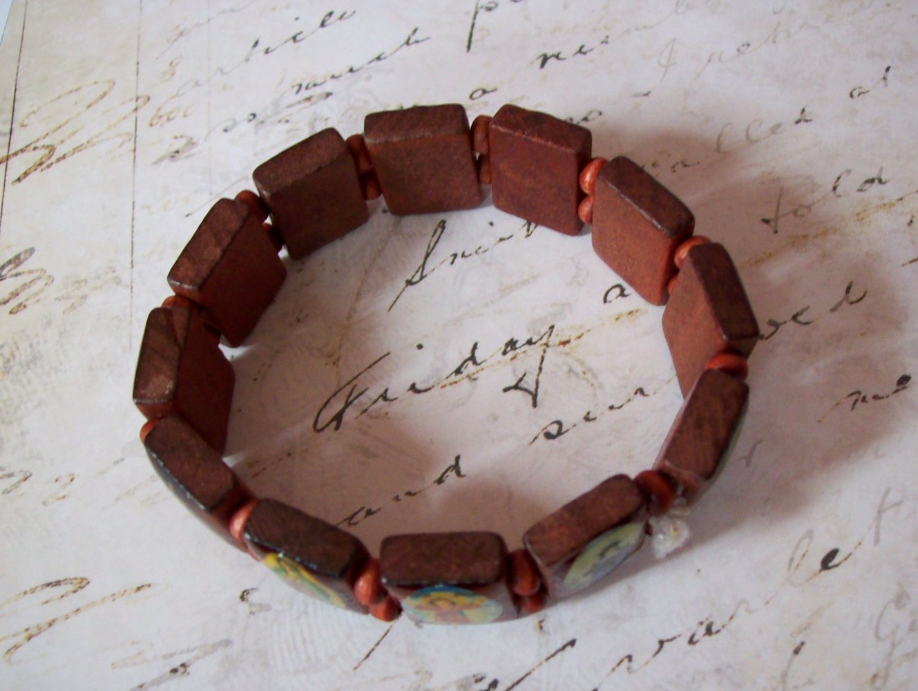 - kurzes Holzperlenarmband mit Heiligen- Bildchen